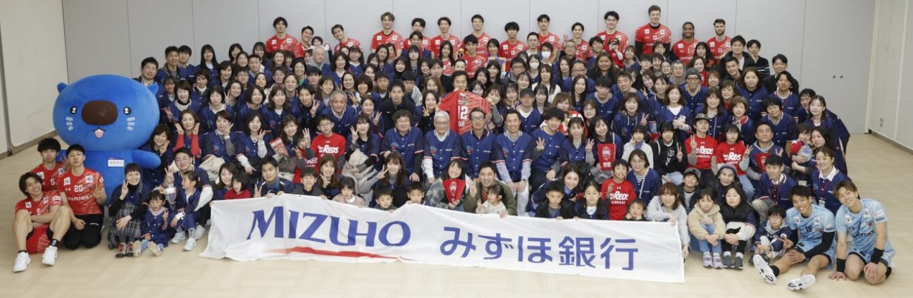 サントリーサンバーズ大阪とのパートナーシップの取り組みを通じて、社内の一体感醸成の取り組みを実施しました。2025年3月30日(日)にAsueアリーナ大阪で開催された大同生命SVリーグのヴォレアス北海道戦を「みずほ銀行 MATCH DAY 関西」と題して開催し、社員やご家族160名様で一緒に試合観戦いただきました。社員のお子様に始球式やサーブチャレンジに参加いただき、社内の皆様には「みずほ銀行×サンバーズ観戦用ベースポールシャツ」を着用いただいて応援いただくなど楽しんでいただきました。試合の最後には、サンバーズの選手と一緒に集合写真を撮影しました。