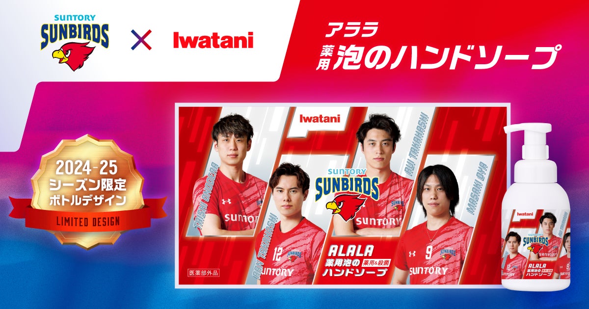 サントリーサンバーズ大阪の活動方針やSDGsへの取り組みなどに共感いただき、オフィシャルパートナー契約を締結し、SVリーグ初代王者に向けて共に戦い、共に脱炭素社会の実現を目指す活動を実施して参りました。コラボレーション商品として、サントリーサンバーズ大阪 2024-25シーズン限定ボトルデザイン「アララ 薬用泡のハンドソープ」を、大同生命 SV.LEAGUEにおけるサントリーサンバーズ大阪のホームゲーム会場や、イワタニ公式オンラインショップ「イワタニアイコレクト」の限定商品として2024年10月14日より発売開始しました。「アララ薬用泡のハンドソープ」は、天然パームヤシ油(RSPO MB認証品)を原料とする環境負荷の低い製品であり、両社のコラボレーションを通じて環境問題に取り組む活動を実施しています。