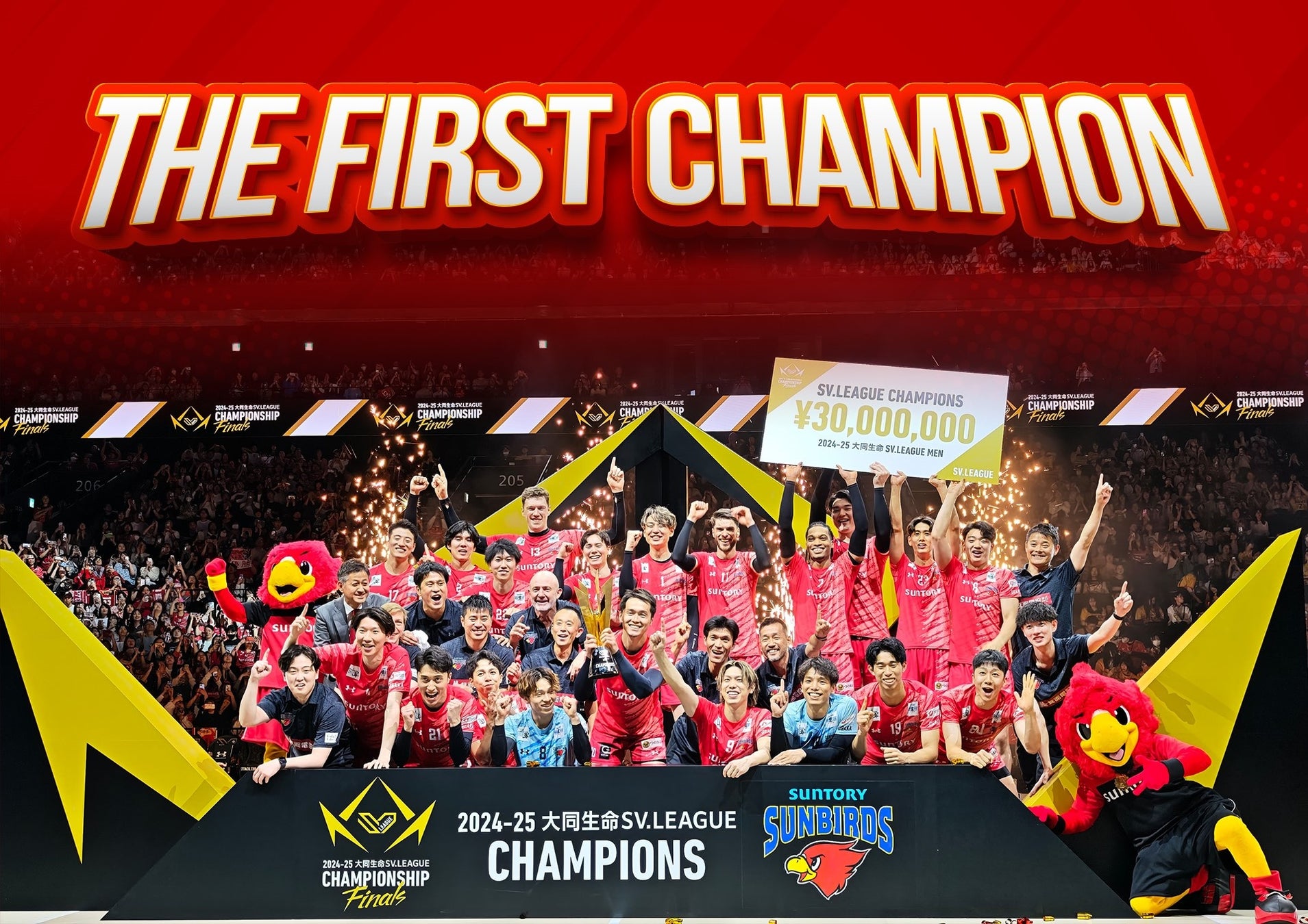 サントリーサンバーズ大阪は、2025年5月5日(月・祝)に開催された2024-25大同生命SVリーグ チャンピオンシップ ファイナルの試合に勝利し、SVリーグ初代王者に輝きました。シーズンを通してサントリーサンバーズ大阪をサポートしてくださったファンの皆さま、地域の皆さま、パートナーの皆さまのお陰でシーズンを戦い抜くことができました。多くの皆さまのご協力に対し、心より感謝と御礼を申し上げます。