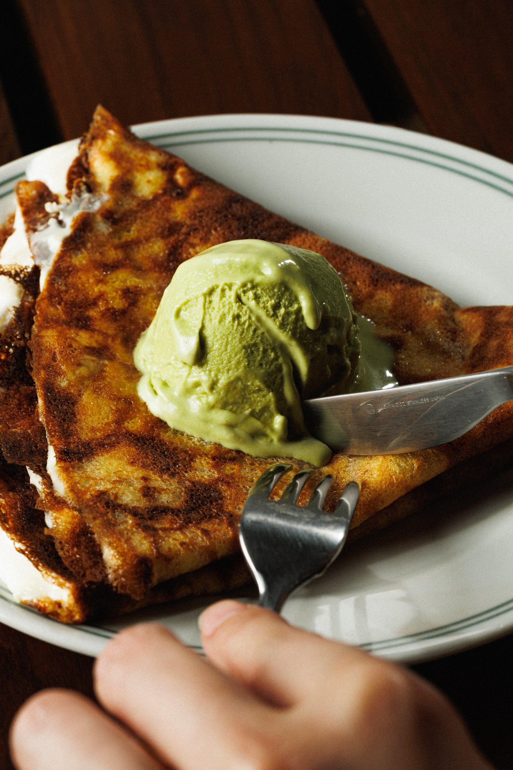 「熱々の焦げクレープに冷たいジェラートの甘さとコクが絶品!」焼きたての香ばしいチーズクレープに添えるのは、何度も試作を重ね、素材の旨みを最大限に引き出した3種のジェラート。