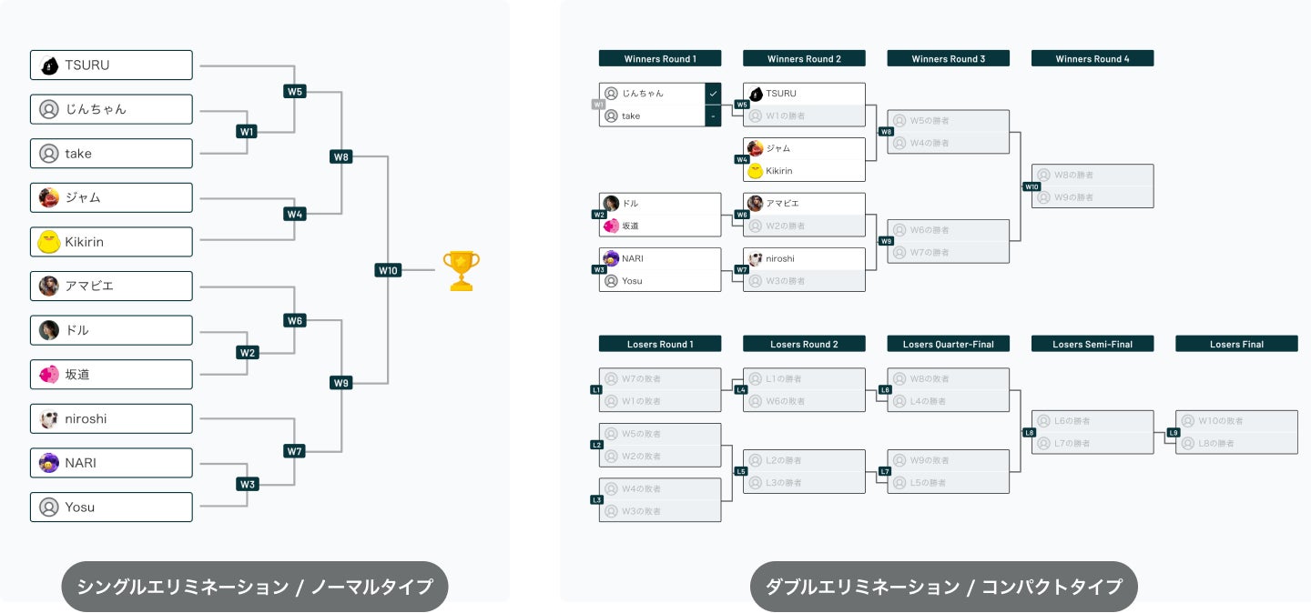 最適な対戦組み合わせの自動作成: 参加者の実力順に登録するだけで、序盤に強い参加者同士が対戦しないよう、最適な組み合わせを自動で生成します。