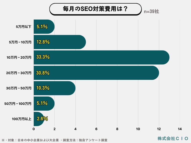 そこで株式会社CIOでは、中小ベンチャー・大企業を対象とした合計39社に、SEO対策の月額コストを調査してみました(業種や売上規模に関わらず無作為に調査を実施)。