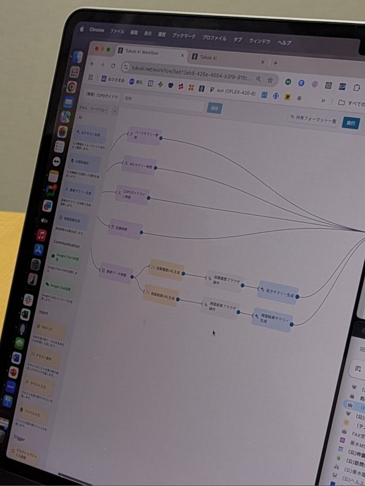 Tukusi AIは、こうした課題を解決し、医療現場でAIを当たり前に使いこなすための環境を目指して開発されたプラットフォームです。モバイルアプリ、デスクトップアプリ、カスタムフォームなどの様々なインタフェースからの情報の受け取り、AIによる情報抽出・要約・分類や、外部チャットツールへの通知、ブラウザ自動化などの機能を自在に組み合わせた「ワークフロー」をノーコードですばやく構築することができます。これにより、現場ごとの多様な業務をエンドツーエンドで効率化します。