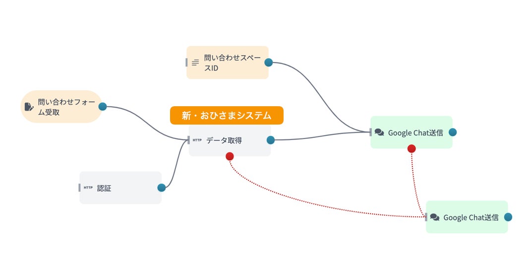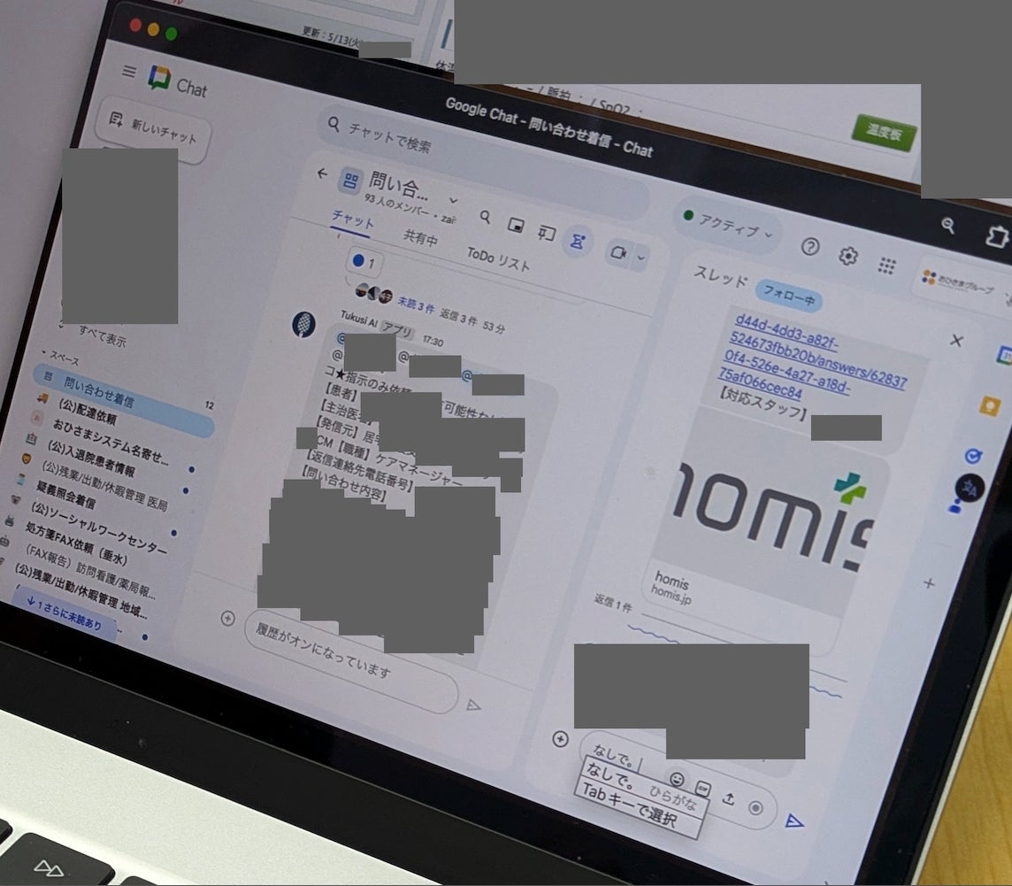 訪問看護からの問い合わせ、薬局からの疑義照会、内部での受電内容の送信を、フォームを起点としたワークフローで処理します。患者をおひさまシステムで検索し、患者に紐づいた担当医師や担当看護師にメンションをつけた形でGoogle Chatに配信します。さらに一部の内容については、フォーム送信後に、自動で電子カルテへの書き込みも行います。