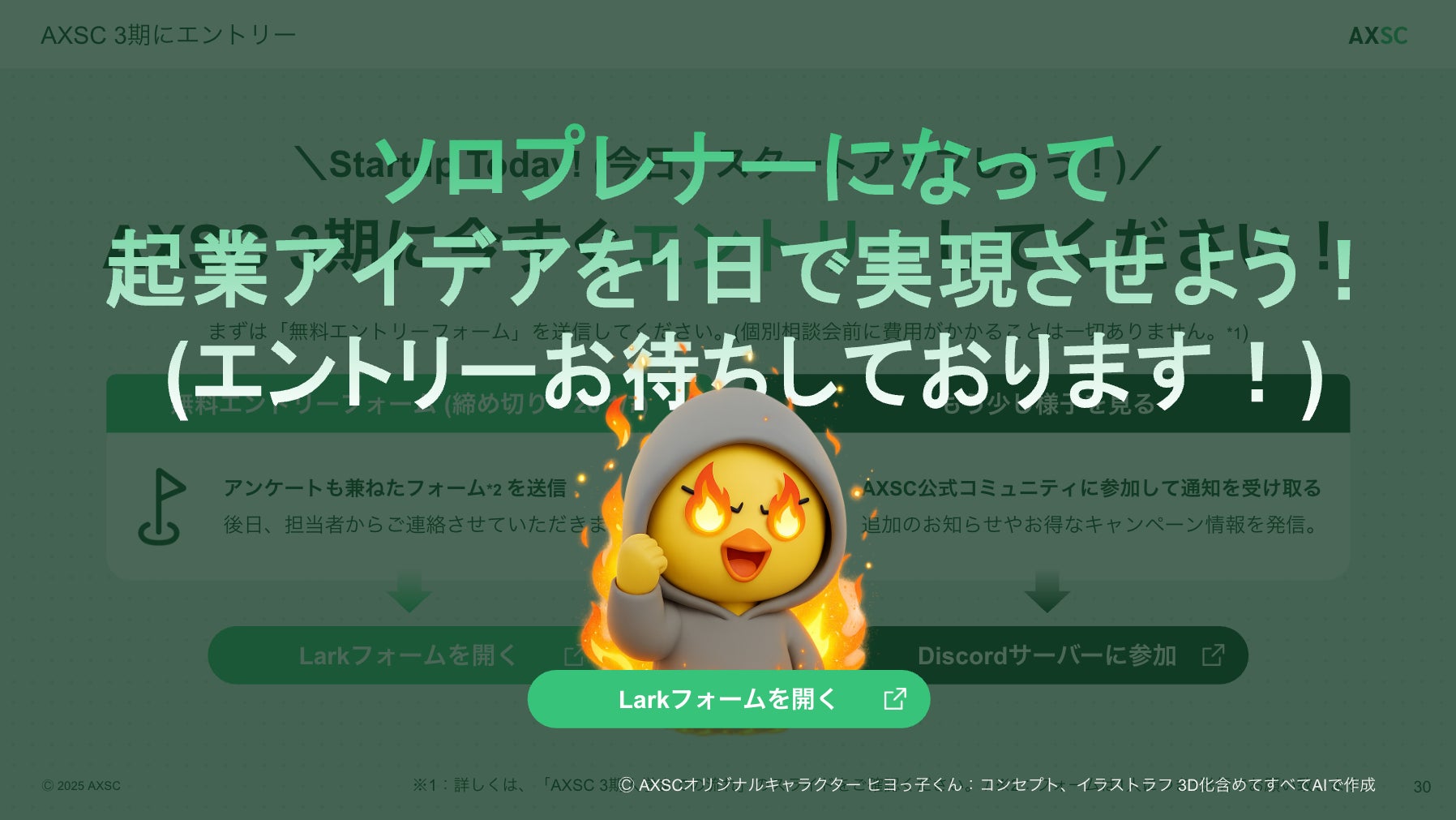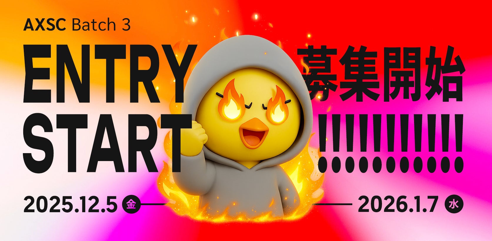 \Startup Today! (今日、スタートアップしよう!)/をスローガンに、AI駆動アクセラレータープログラム「AXSC(アクスク)」を展開するAxla合同会社 (本社:東京都、代表:川原 ぴいすけ、以下「当社」) は、2025年12月5日(金)から、AXSC 3期生のエントリー受付を開始することをお知らせいたします。
