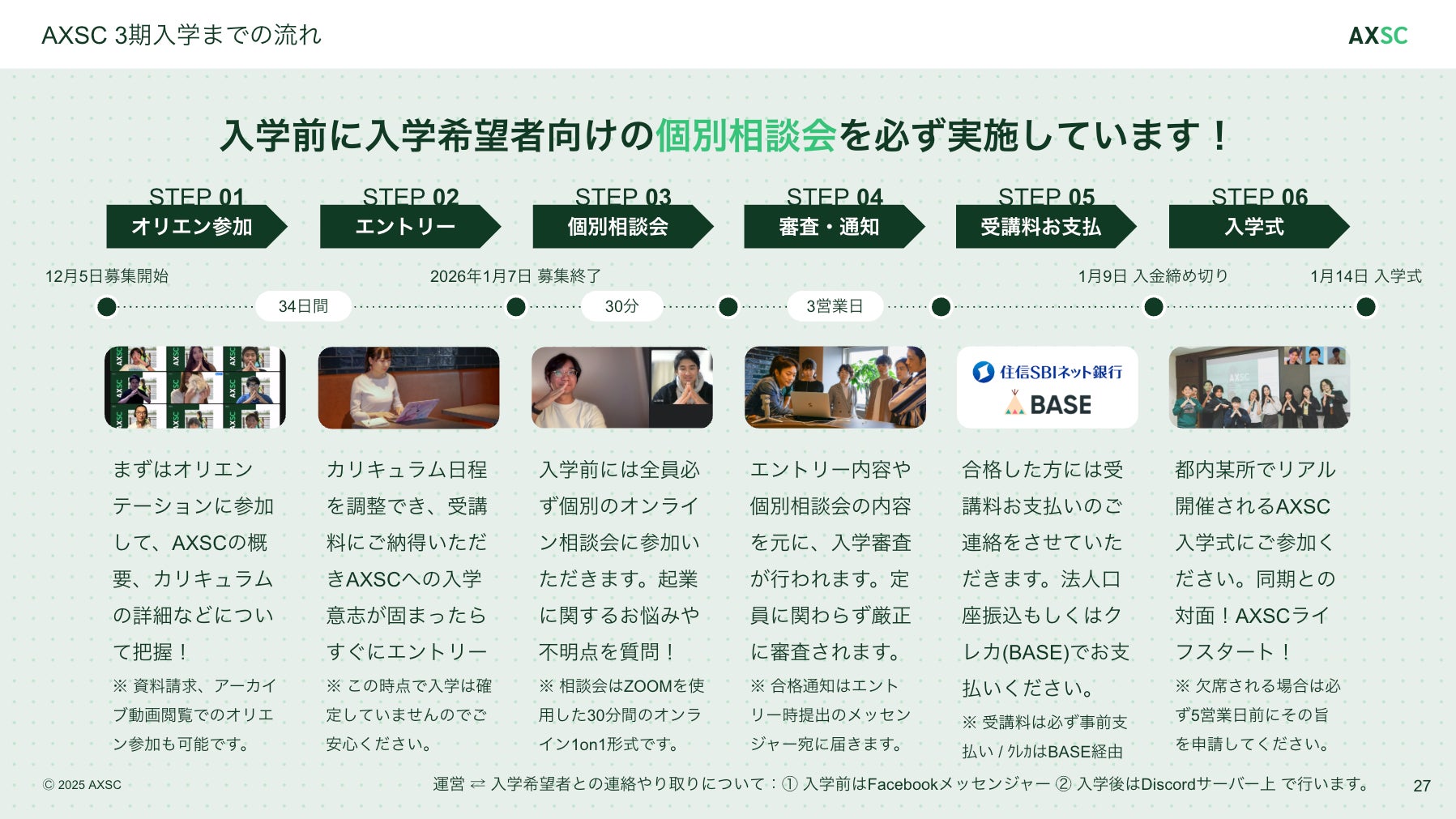 この場所で学んだ知識とスキルと経験、そして同期の存在が、あなたにとって「一生モノの宝」になることを心より願い、 私たちAI駆動アクセラレーターAXSCが全力で伴走させていただきます。