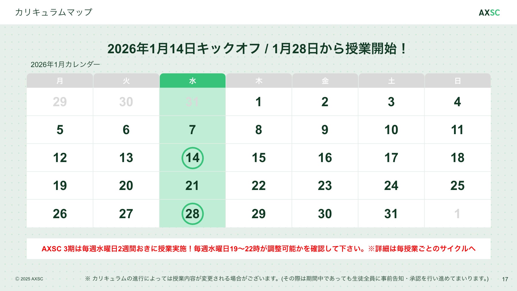 ・カリキュラム期間:2026年1月14日 〜 2026年6月10日の約150日間