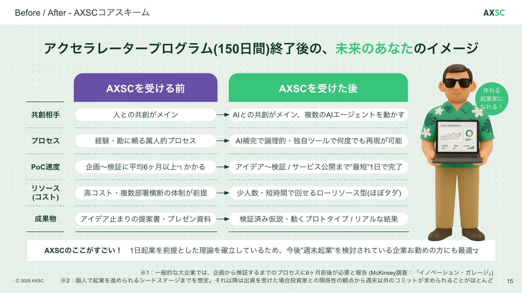 AI活用によって「1日起業」を実現させる150日間のアクセラレータープログラム「AXSC」が、3期生(2026年1月開始期)を募集開始 のお知らせ