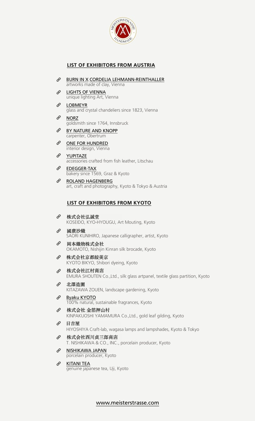 オーストリアと日本の卓越した職人による工芸品を展示。オーストリアからは受賞歴のあるインテリアデザインと照明、LOBMEYR(ロブマイヤー)のシャンデリア、オーストリアの陶芸、家具、金属工芸、ガラス食器、高級アクセサリー、ジュエリー、チョコレートとワイン等。京都の企業からは京表具、かなアート、西陣の金襴、絞り、絹のグラスアートパネル、苔テラリュウム、金箔、白檀ミスト、日本茶、京和傘、京焼・清水焼、NISHIKAWA JAPANの茶器など。