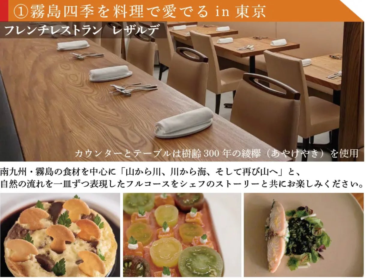 宮崎県・霧島の銘木を扱う『ひなもり銘木』が、5月25日、東京・中央区のフレンチレストラン『レザルデ』とコラボ。希少で美しい銘木のプレートに霧島の食材をのせ、自然の恵みを味わうランチコースを提供します。