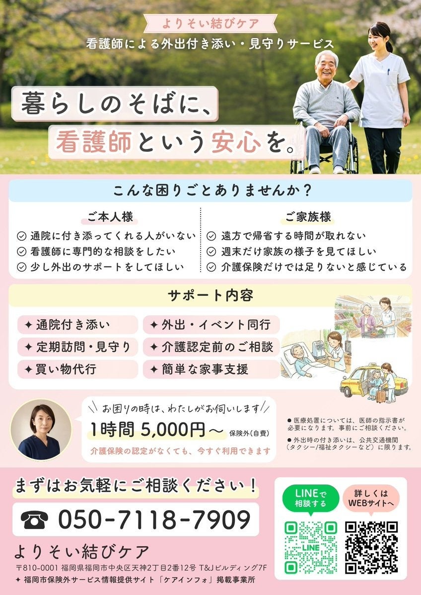 「よりそい結びケア」は、看護師が高齢者の通院同行・外出支援・日常の見守りを行い、その日の様子や医師からの説明をLINEや電話でご家族に共有する、保険外(自費)のサービスです。