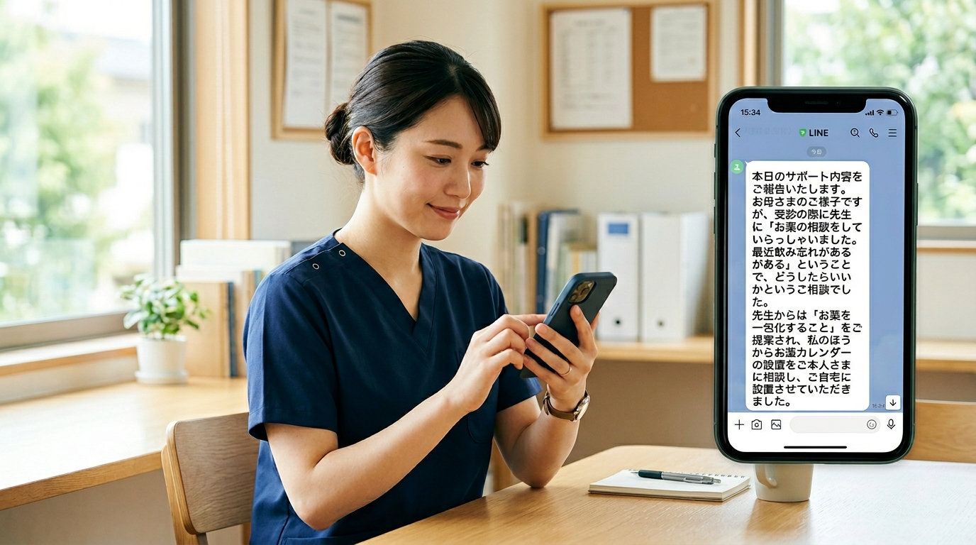 看護師がそれを「家族の言葉」に翻訳し、分かりやすく整理してお伝えすることで、ご家族は離れていても正確な情報をもとに判断ができるようになります。