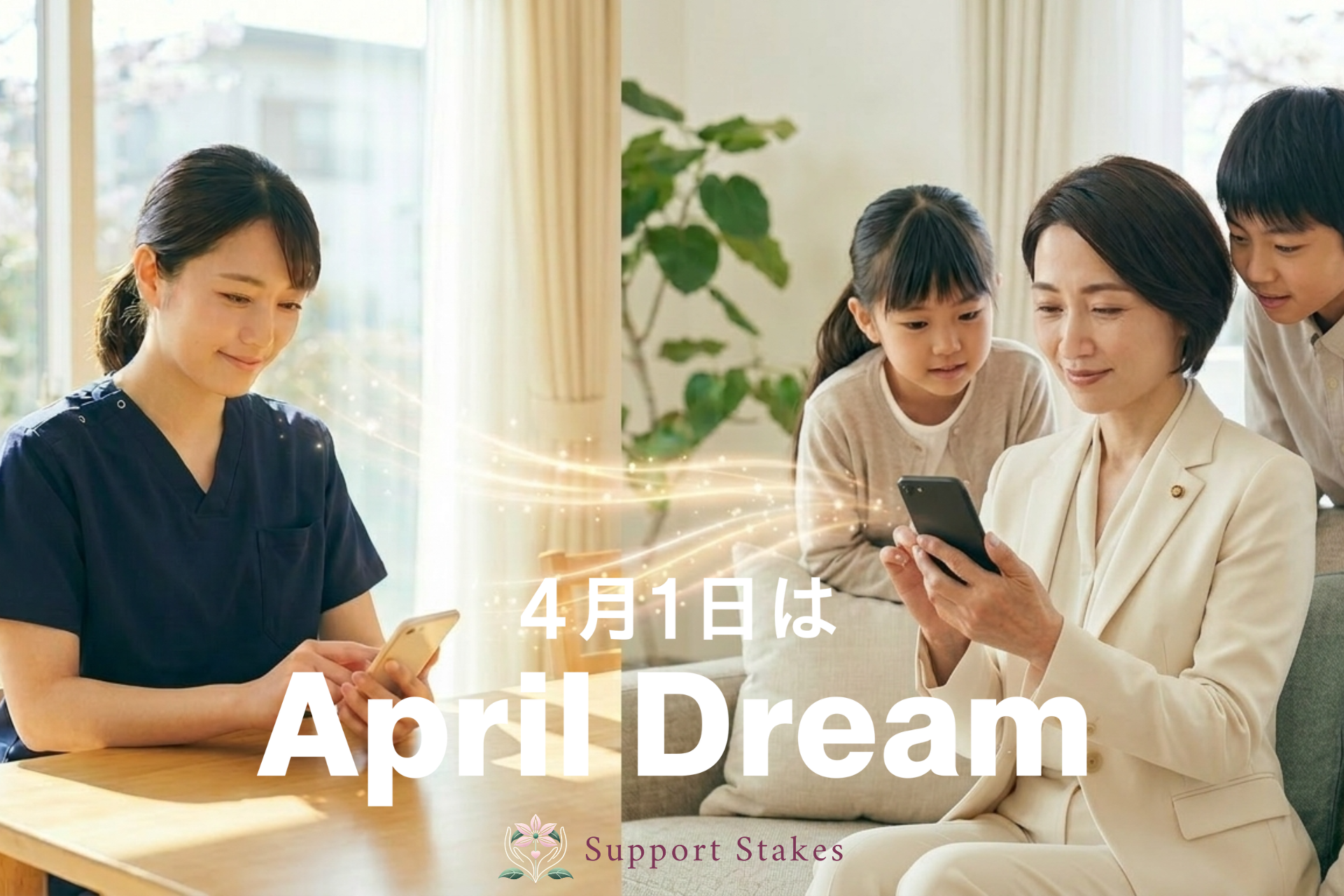 Support Stakesは、看護師による保険外の外出支援・見守り・ご家族への情報共有サービス 「よりそい結びケア」 を通じて、遠距離介護に不安を抱えるすべての家族の悩みをゼロにすることを目指しています。これが私たちの April Dream ――本気で叶えたい夢です。