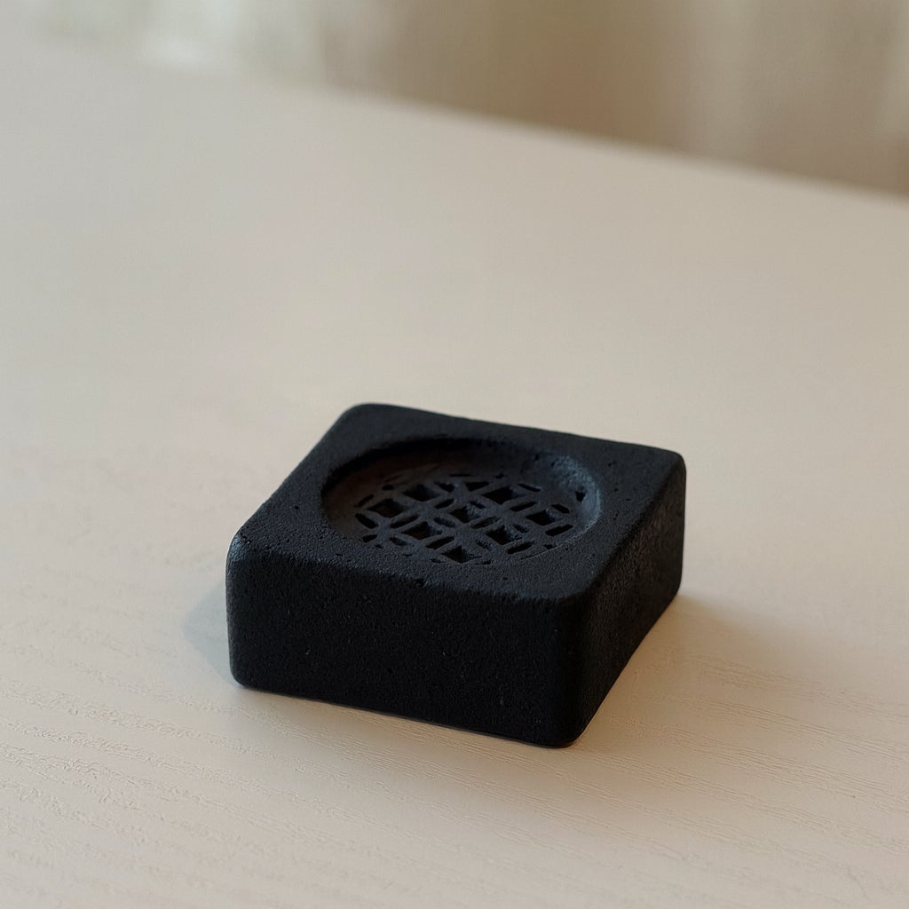 中央に精油(アロマオイル)を垂らす円(七宝文様)のくぼみを設けた四角いキューブ。炭の吸着性を活かした仕様。