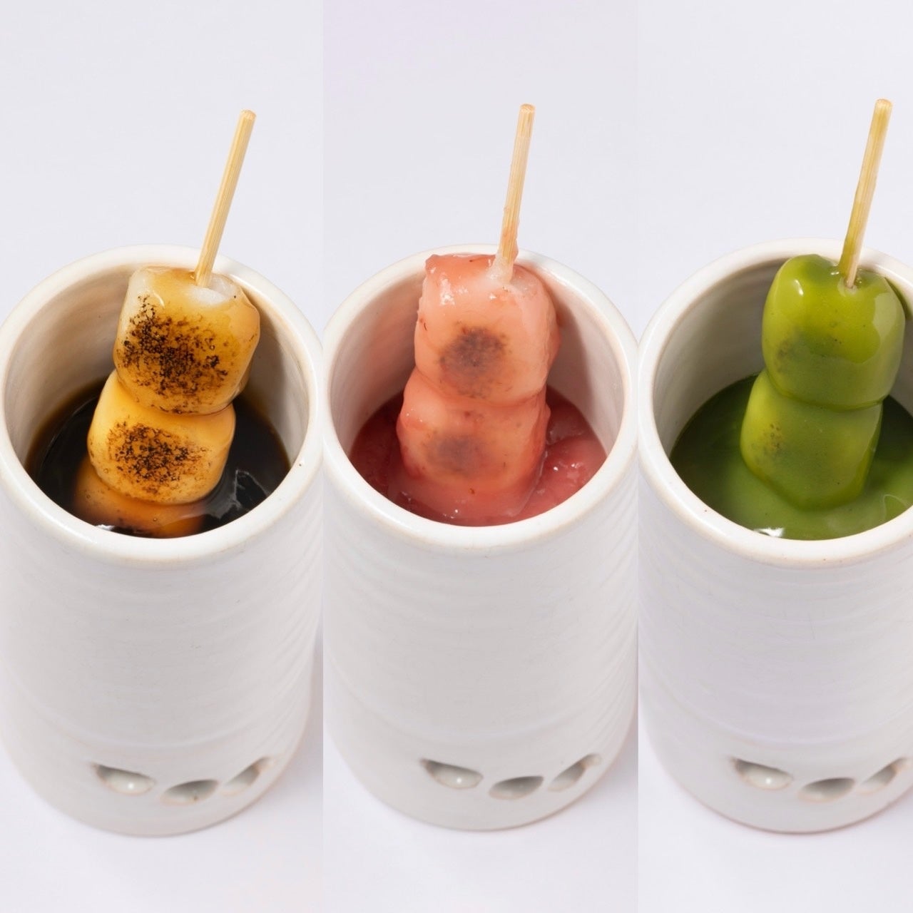 KINOCAFE特製のみたらし団子は、「しょうゆ餡」「いちご餡」「まっちゃ餡」の3種類をご用意。
