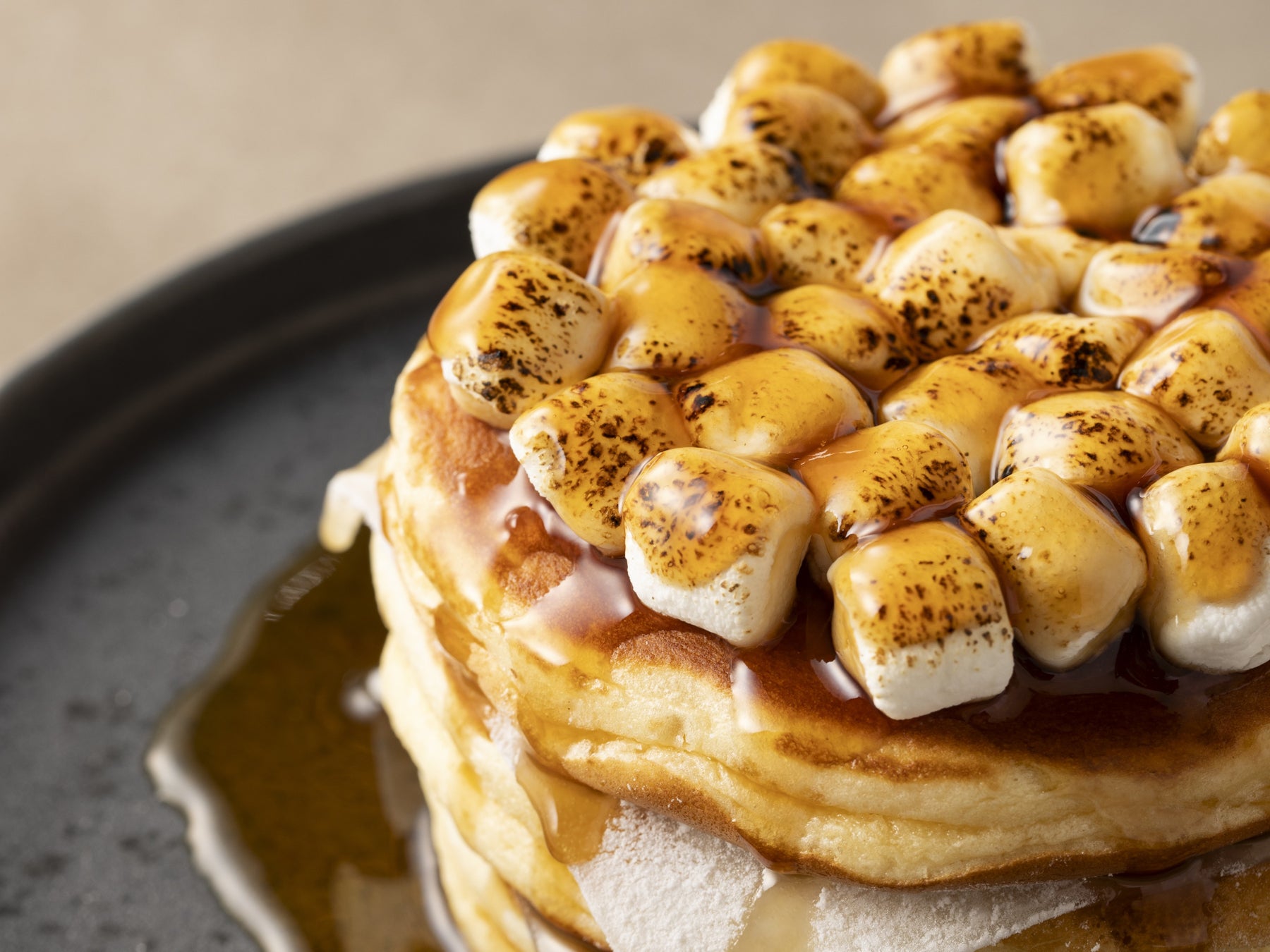 ふわふわのマイクロマシュマロをのせて特製みたらしメープルシロップをたっぷりと。