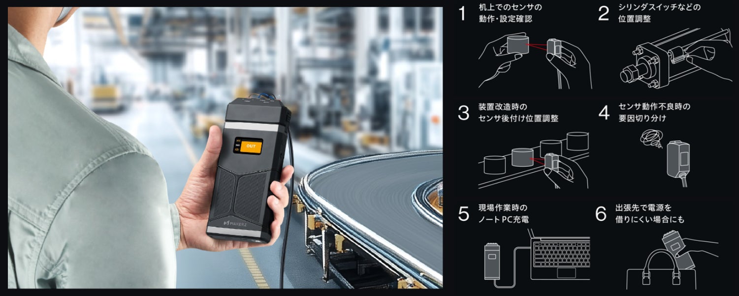 「ハンディパワーサプライ DPZMシリーズ」は、机上でのセンサの動作確認や、シリンダスイッチの位置調整、装置改造時のセンサ後付け位置調整、電源が取りづらい場所でのセンサの設定調整、出張先での装置立ち上げ業務などさまざまなシーンで活躍します。特に、電源が確保しにくい場所での作業をサポートし、作業効率を大幅に向上させます。