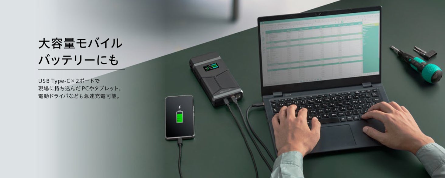 また、大容量モバイルバッテリーとしても活躍。現場に持ち込んだPCや電動ドライバなども急速充電が可能です。