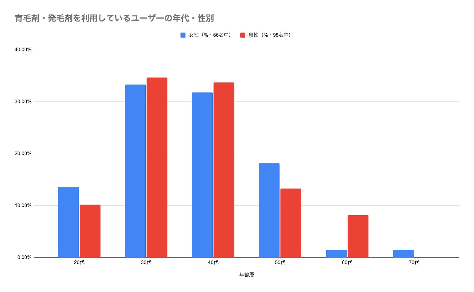 また、男性の回答者数が98名、女性は66名と、やや男性が多めではあるものの、女性も4割近くを占めており、育毛・発毛への関心が男性だけにとどまらないことも読み取れます。