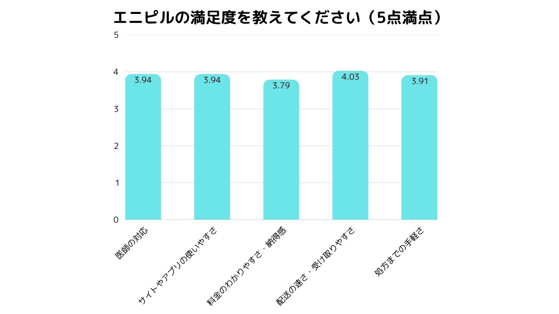 エニピルのサービス満足度に関する調査では、5点満点の各項目評価において、医師の対応(3.94点)や配送の速さ・受け取りやすさ(4.03点)など、医療の質と利便性に関する項目が特に高い評価を得ました。