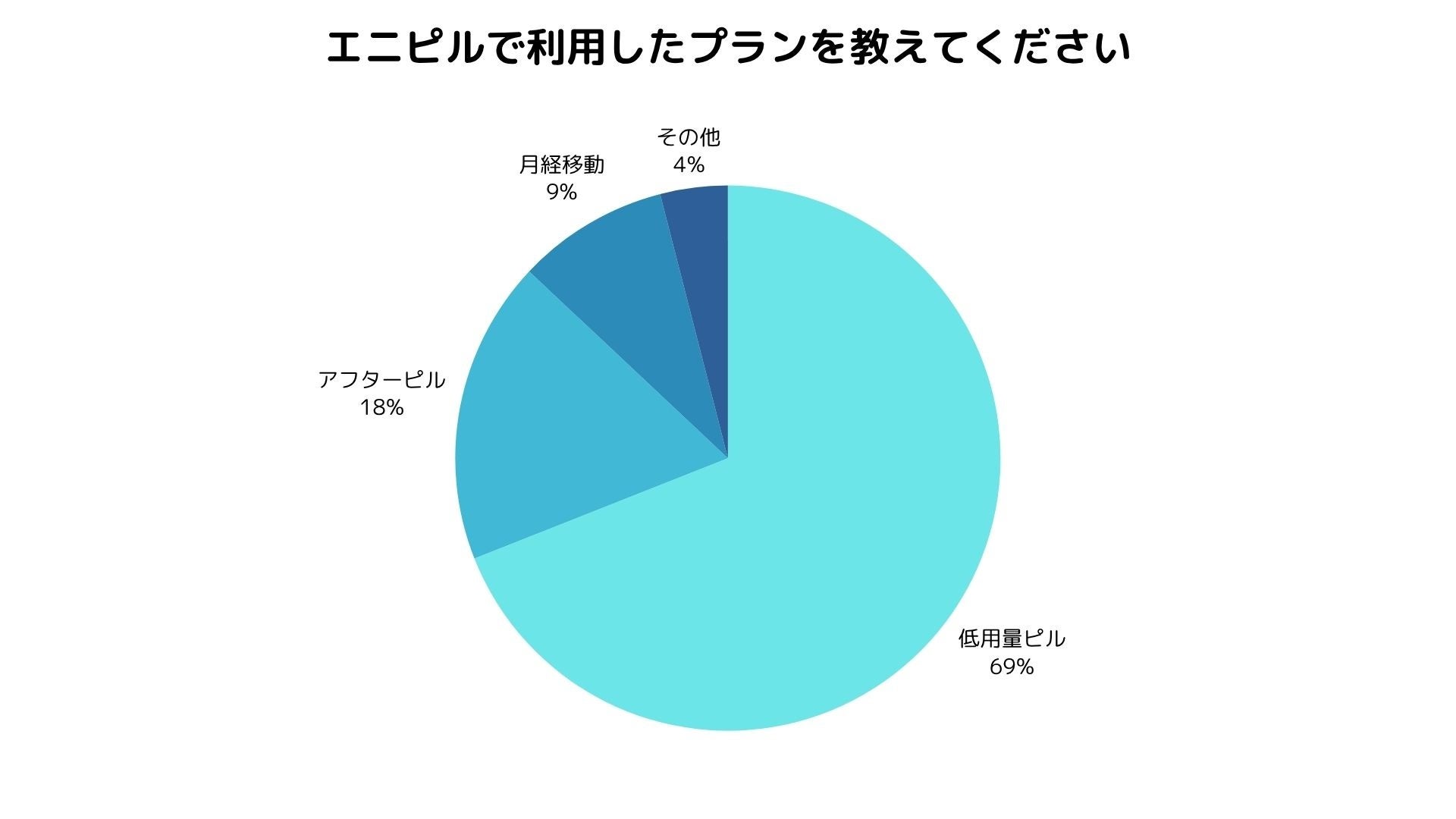 まず、エニピルで最も利用されているプランは「低用量ピル」(69.7%)。次いで「アフターピル」(18.2%)、「月経移動ピル」(9.1%)、「その他」(3.0%)という結果になりました。