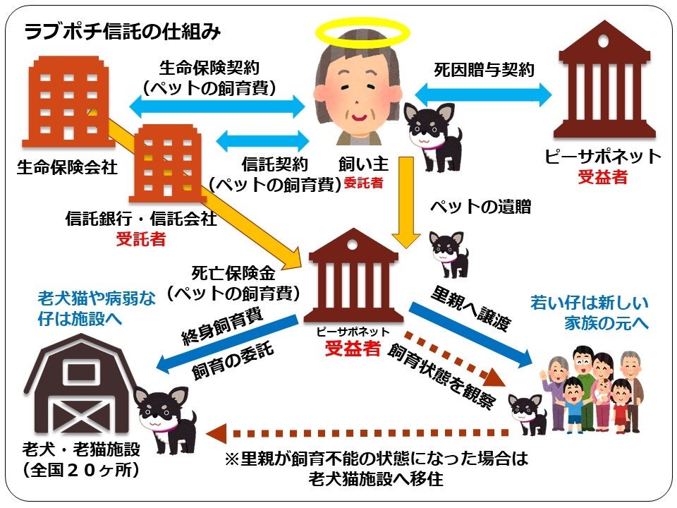 この仕組みは、認定NPO法人ピーサポネットが運営する「ラブポチ信託Ⓡ」によって提供され、飼い主に万が一のことがあった場合、老犬・老猫施設での終身飼育や、新たな里親探しを通じてペットの命を守るものです。
