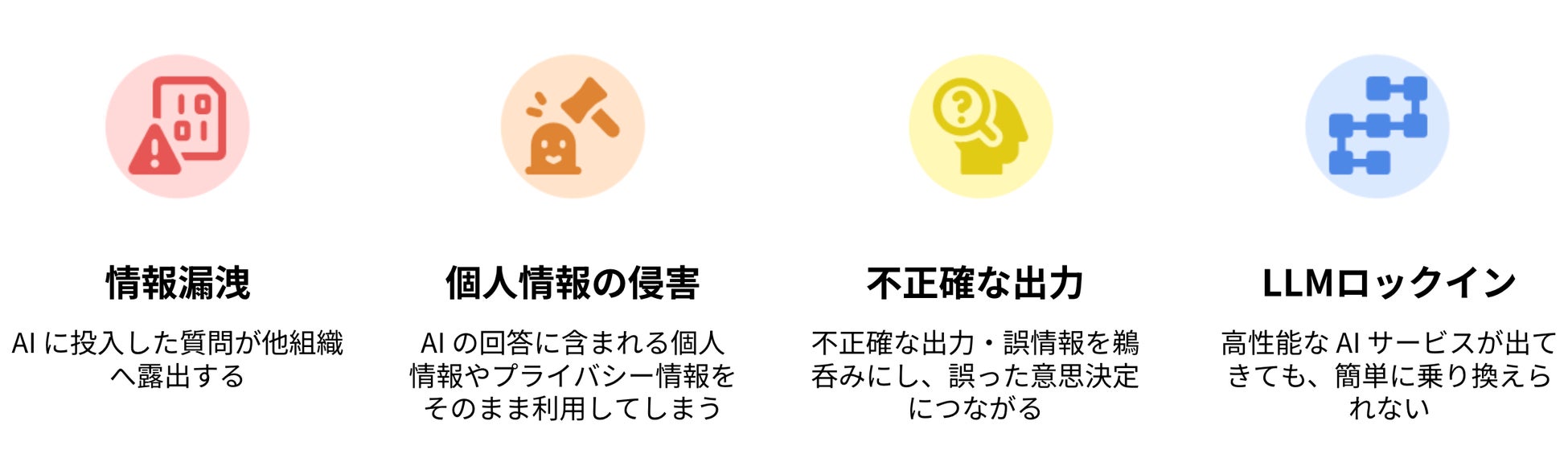 生成AIは業務効率化、生産性向上、新規事業創出といった大きなメリットを持つ一方で、プロンプト経由での機密情報漏えい、未承認AIサービス(Shadow-AI)の使用、AIエージェントによる過剰なアクセス権限の付与、API利用料金の急増など、従来のセキュリティ対策ではカバーしきれない新たなリスクが生じています。このようなリスクへの懸念が企業の積極的なAI活用を阻んでいる現状があります。
