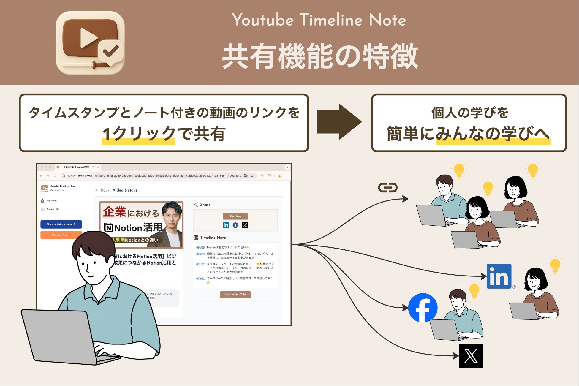 YouTube Timeline Noteで残したメモとYouTube動画をセットにして、SlackやXなどで簡単に共有できるようになりました。単なる動画のシェアだけでなく、動画のシーンごとの考察やメモを共有できるため、ビジネス業務やナレッジ共有はもちろん、プライベートでも活用できるアップデートです。