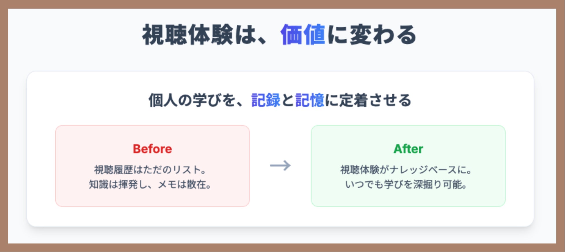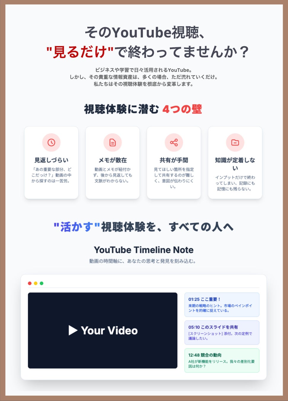 YouTube Timeline Noteを活用いただくことで、個人の学びを更に深く記録にも記憶にも定着化でき、さらに個人の学びを組織の資産に変換できるようになります。これは単なる機能追加ではなく、働き方そのものを変える変革だと確信しています。