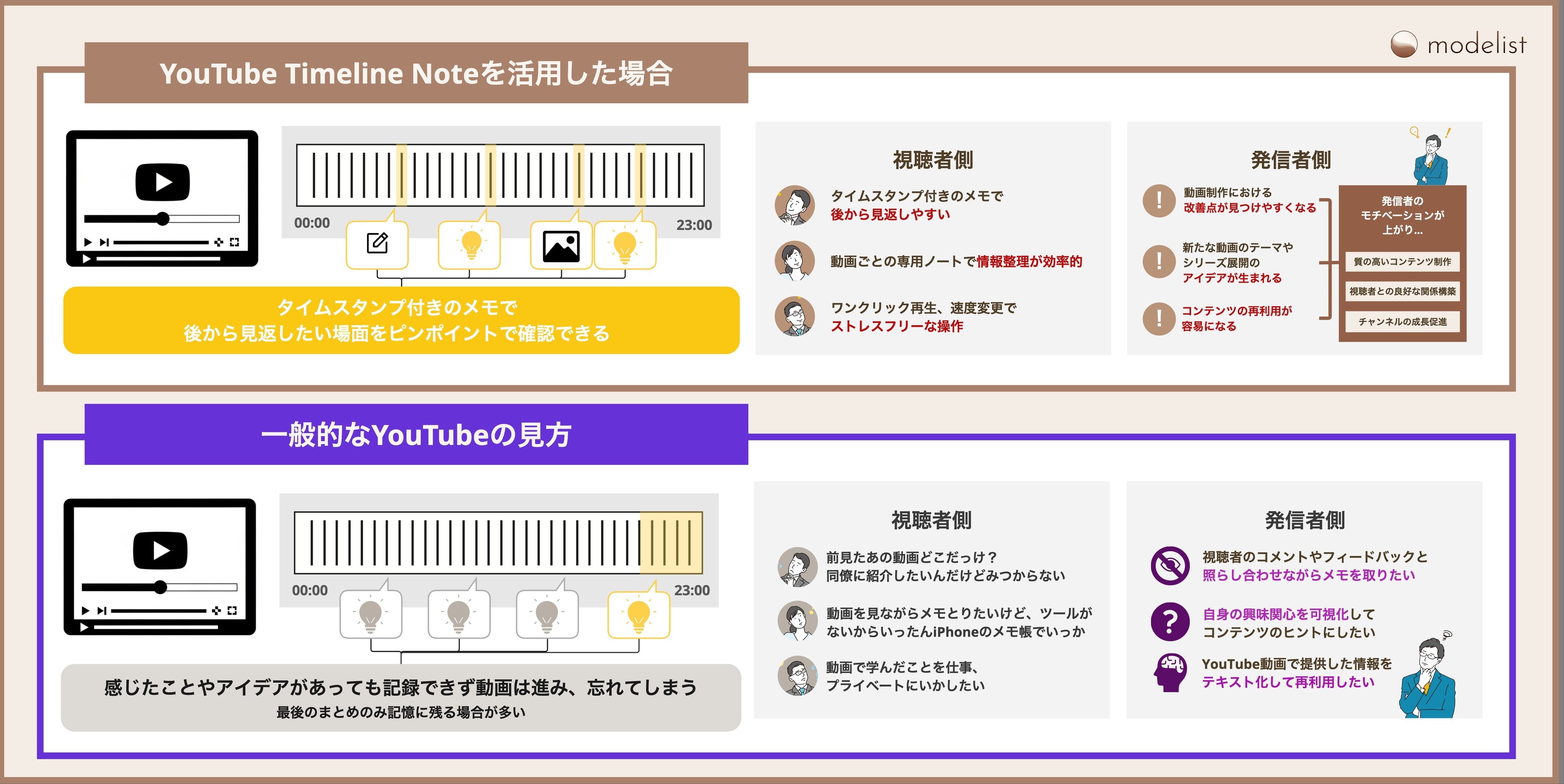 Modelistが開発する「YouTube Timeline Note」は、YouTube動画の特定のタイムスタンプにメモを残せるツールです。動画の該当シーンと完全連動したノート機能により、学習効率を大幅に向上させます。