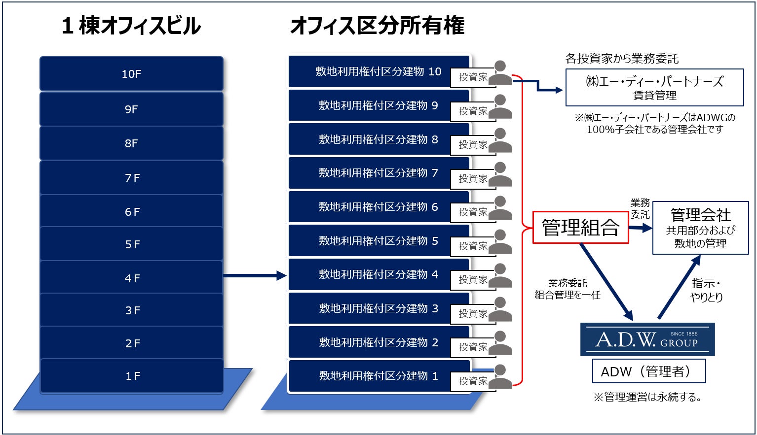 オフィス区分商品「ARISTO PLUS」は、不動産小口化商品「ARISTO」と同様に、都心のビルの一部を、手元の資金や投資計画に合わせた金額で購入でき、さらに管理組合の運営をADWに一任することで管理の手間もかからない点が投資家にとってのメリットです。オフィス区分商品は、例えば10階建であれば一棟当たり10名での保有となるため、一棟で購入する10分の1程度の価格で、都心オフィスビルの一部を保有できることになります。