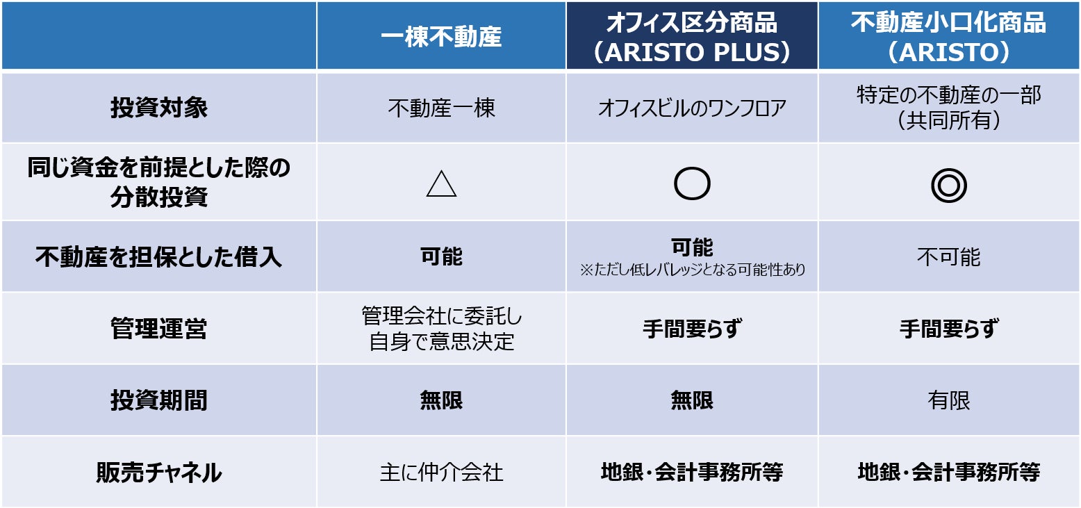 オフィス区分商品「ARISTO PLUS」は、不動産小口化商品「ARISTO」の商品特徴に加えて、