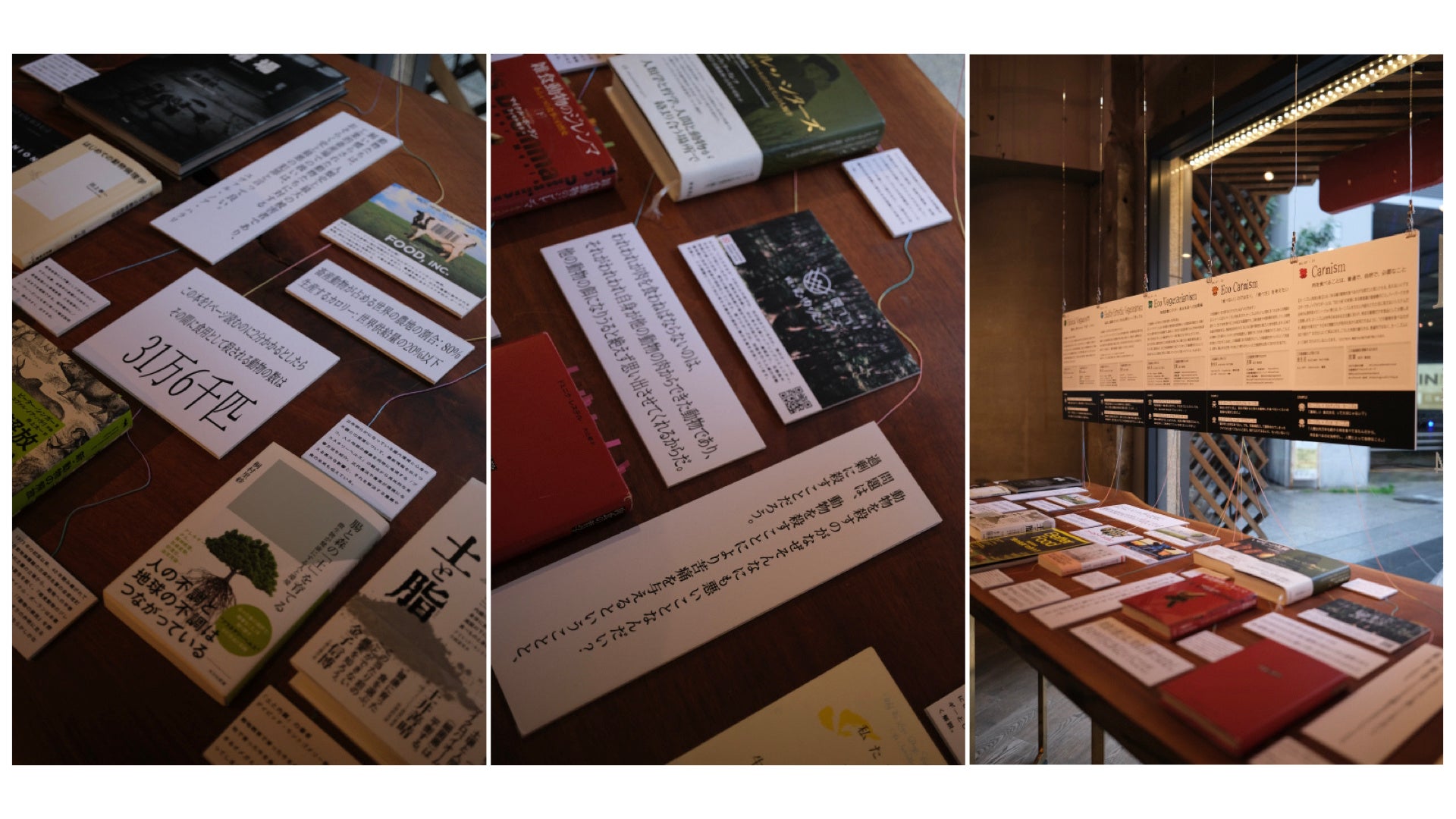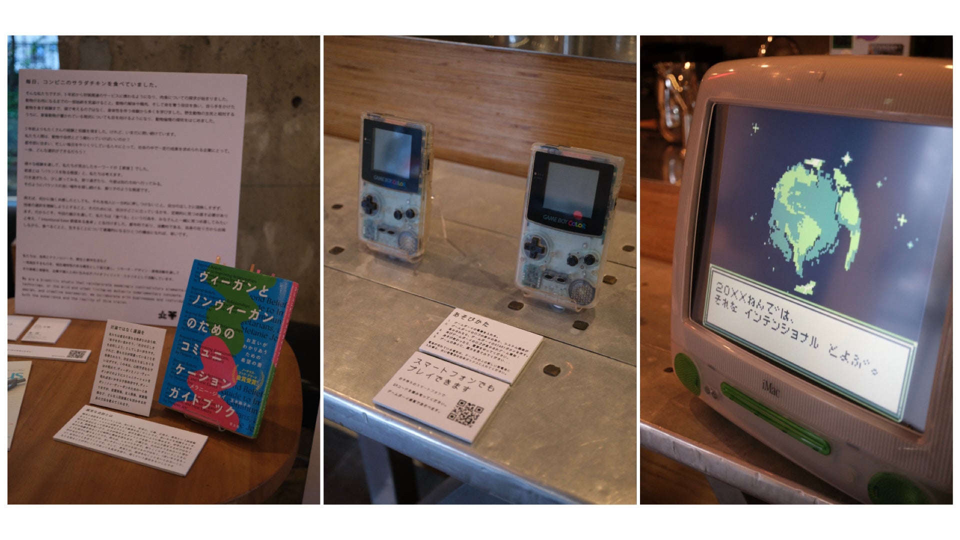 本展示では、ジョイ博士の主張からヒントを得ながらも、肉食主義 vs 菜食主義といったイデオロギーを対立化させるのではなく、その間にあるグラデーションをできるだけ解像度高く可視化することに主眼を置き、構成しました。肉食の背景にある様々な視点を、図解・書籍・ゲームボーイでプレイできるミニ・ロールプレイングゲームなど様々なメディアを用いて多角的に紹介しています。本展示は、この食べ方が正解、といった答えを持ち合わせているわけではなく、肉食の是非の判断は行いません。この展示をみて自分の食べ方をもう一度、見直してみませんか?