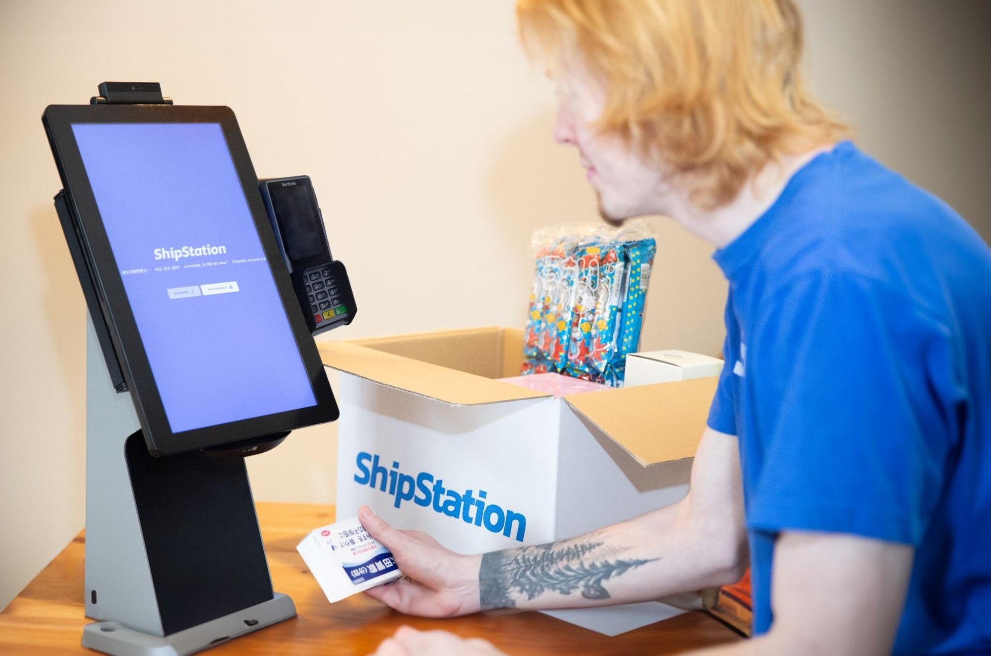 ShipStationには新たな機能が追加され、これまで利用者が手入力していた商品の情報を、付属のバーコードスキャナーで簡単に読み取れるようになりました。商品に付いているバーコードをスキャンするだけで、商品名やHSコードなど必要な情報が自動で入力されるため、書類作成にかかる時間を大幅に短縮できます。セルフレジを操作する感覚で、国際発送の手続きもスムーズに進められます。