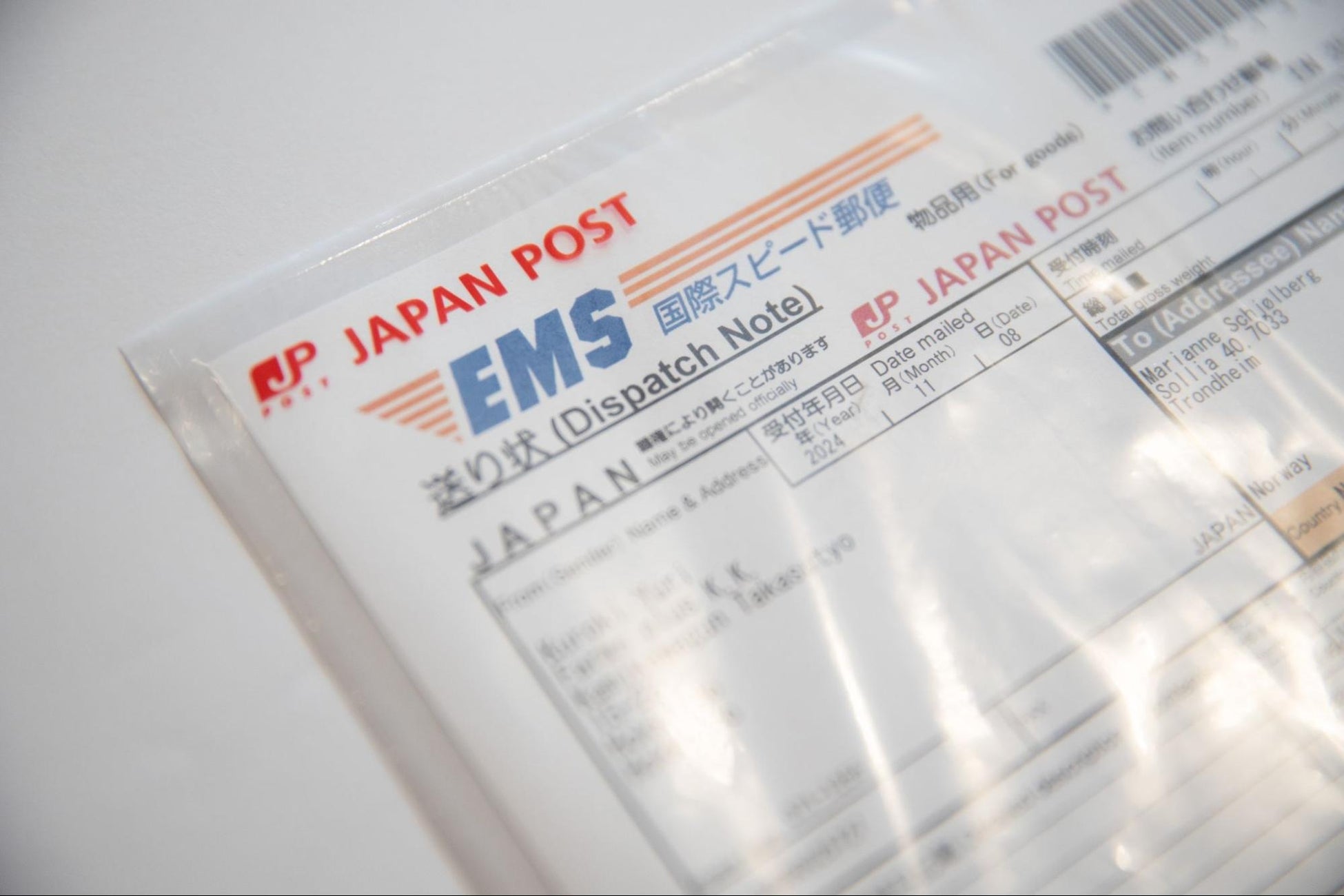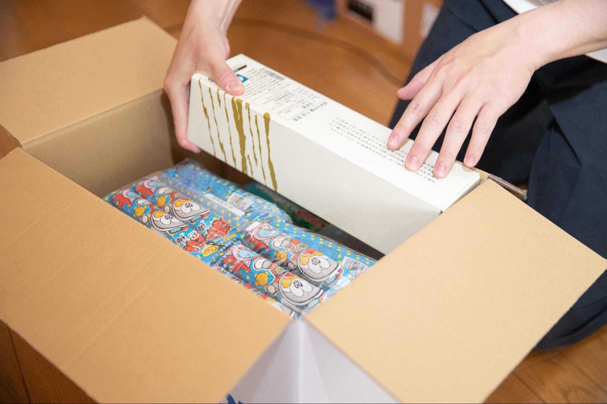 印刷された送り状、税関告知書、インボイスをパウチに入れ、発送用ダンボールに貼り付けます。