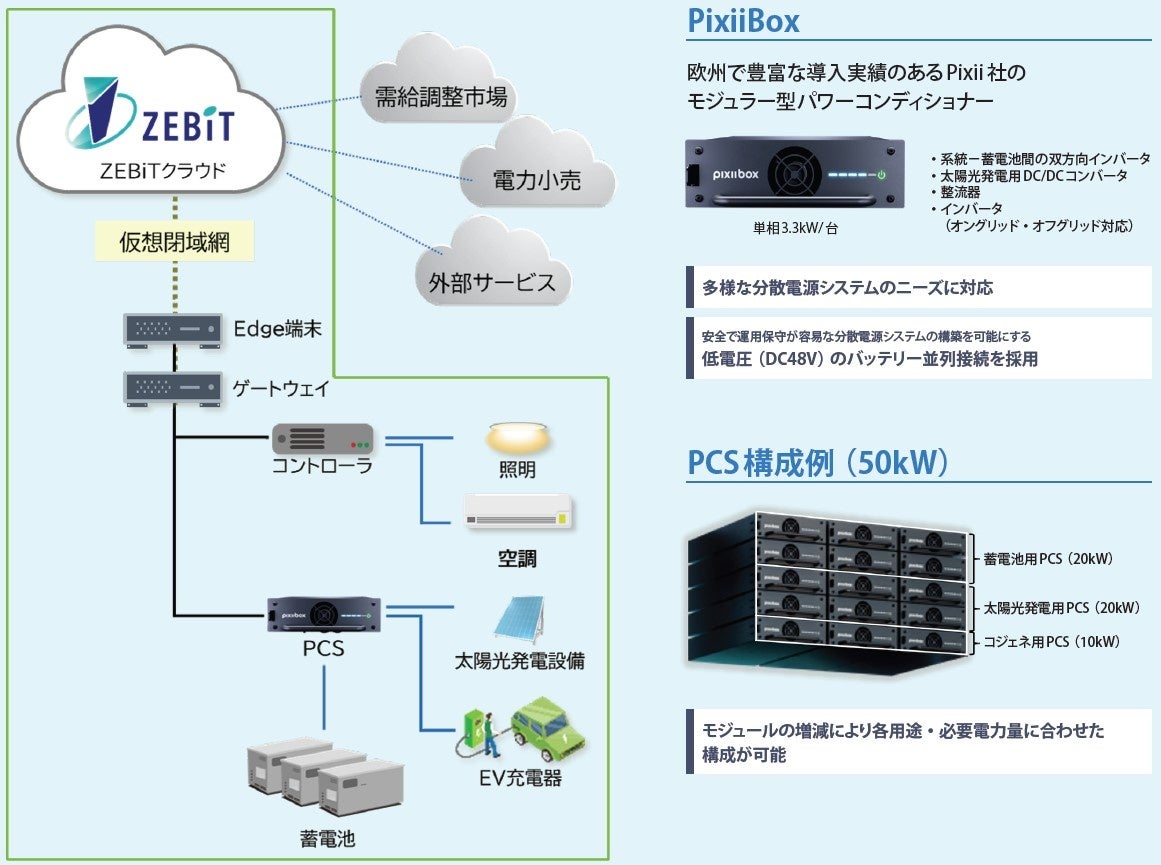 河村電器産業、SCSK、Pixiiの3社が、各社の技術力を結集して開発。高圧受電配備(キュービクル)、パワーコンディショナー、蓄電池を組み合わせて一体型で提供し、分散配置されたエネルギーリソースをクラウドから一括で統合管理・制御。電力を最適にマネジメントすることで、効率的な電力消費を実現。