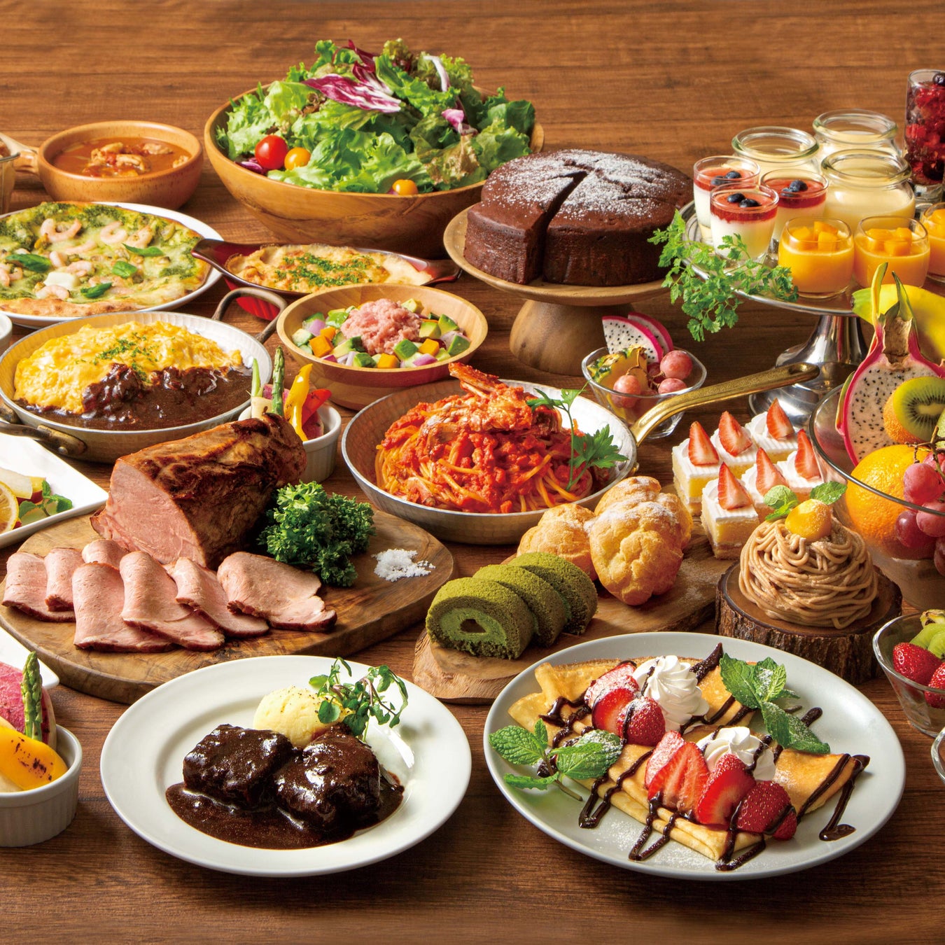 種類豊富な料理と、目の前で焼き上げるクレープをはじめ、ケーキやフルーツが並ぶデザートビュッフェが自慢のレストラン。