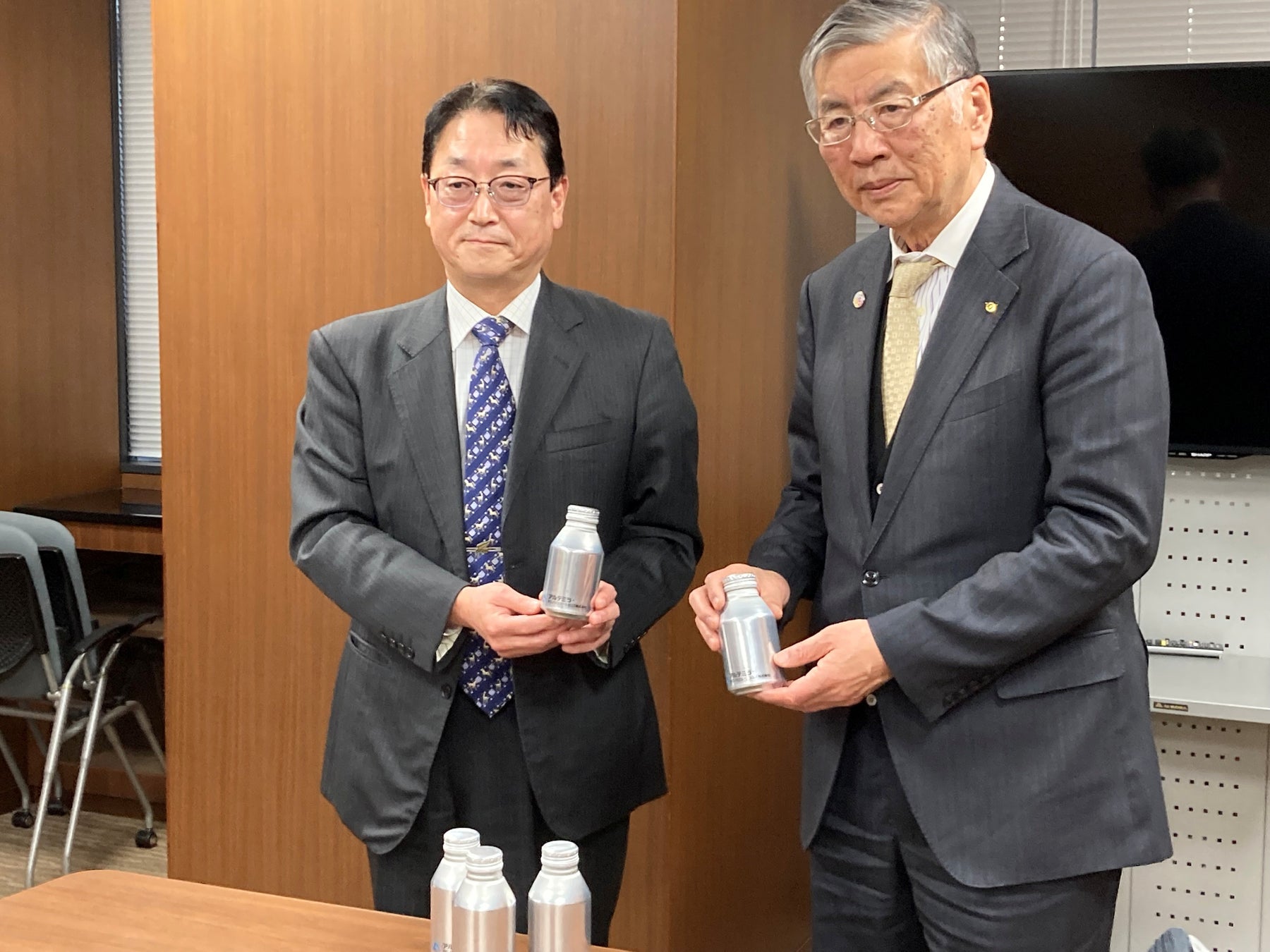 アルミ貯金ボトルの提供を受けた藤沢市の鈴木恒夫市長は「藤沢市はアルテミラ・テクノソリューションズさまと共に貴重なリサイクル資源が国内で循環されるよう取り組んでいます。このアルミ貯金ボトルも、使用済みアルミ缶を再生して作られていると聞きました。藤沢市における環境学習や環境啓発イベントで利用させていただきたいと思います。」と述べました。アルテミラ・テクノソリューションズの中山社長は「アルテミラグループはUBCを再び飲料用アルミ容器へとリサイクルする水平リサイクルにいち早く取り組んできました。藤沢市からは長年、しっかりと分別された質の高いUBCを供給していただき、この事業を支えていただきました。当社のアルミ貯金ボトルが藤沢市のリサイクル推進に役立つことを願っています」と述べました。