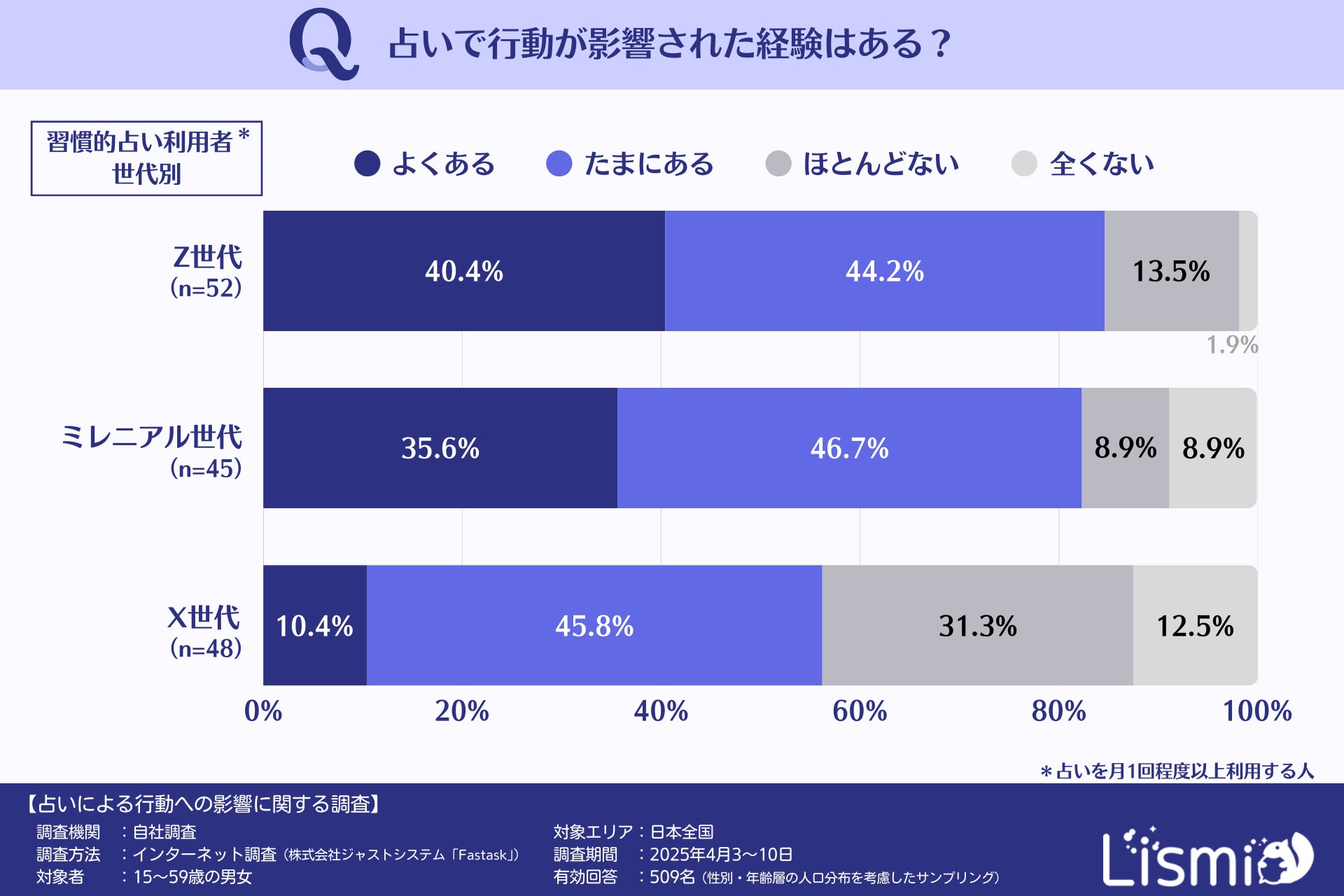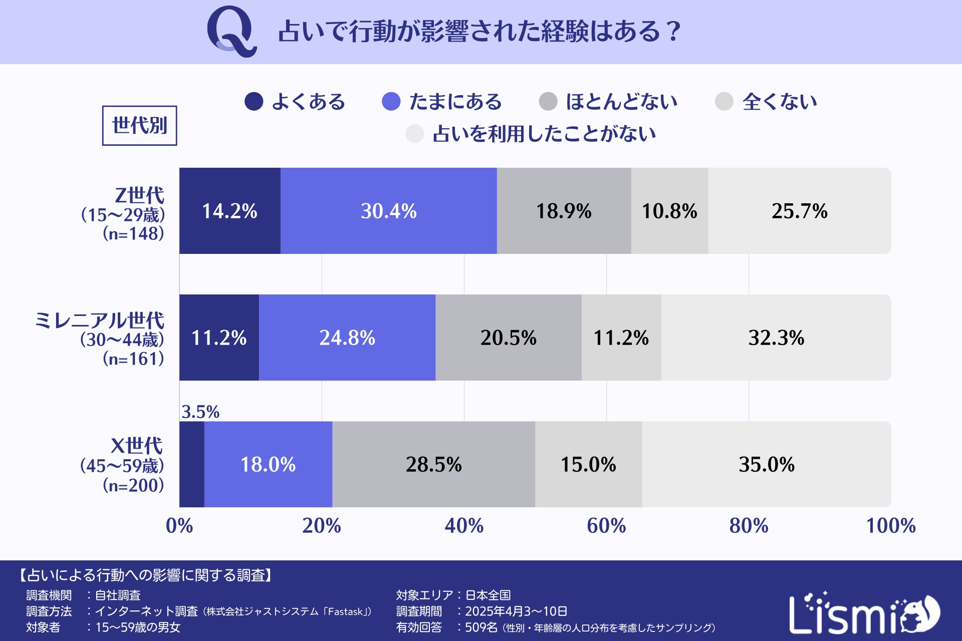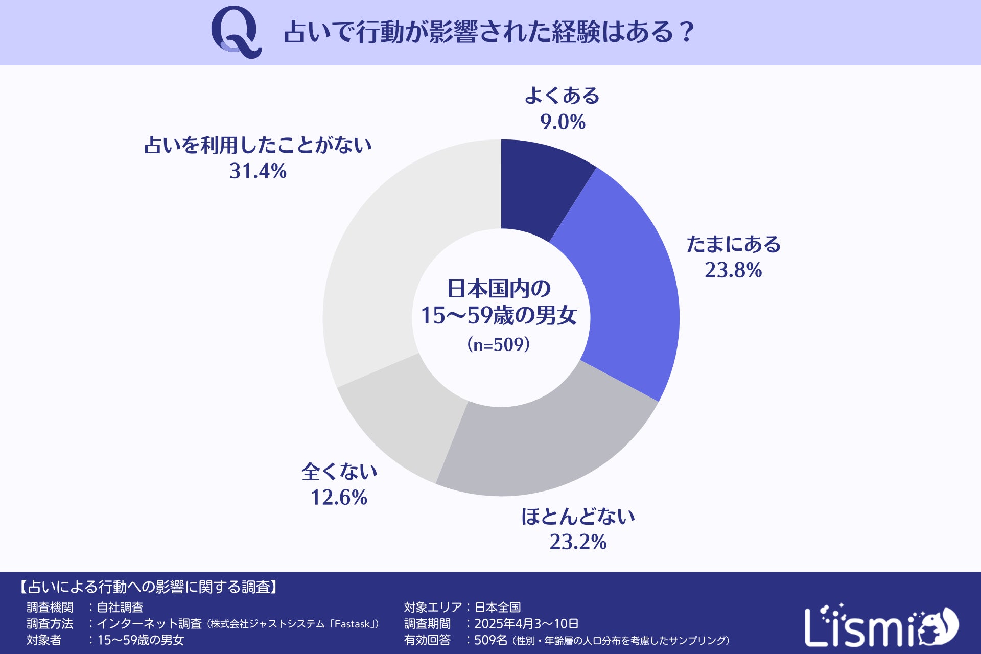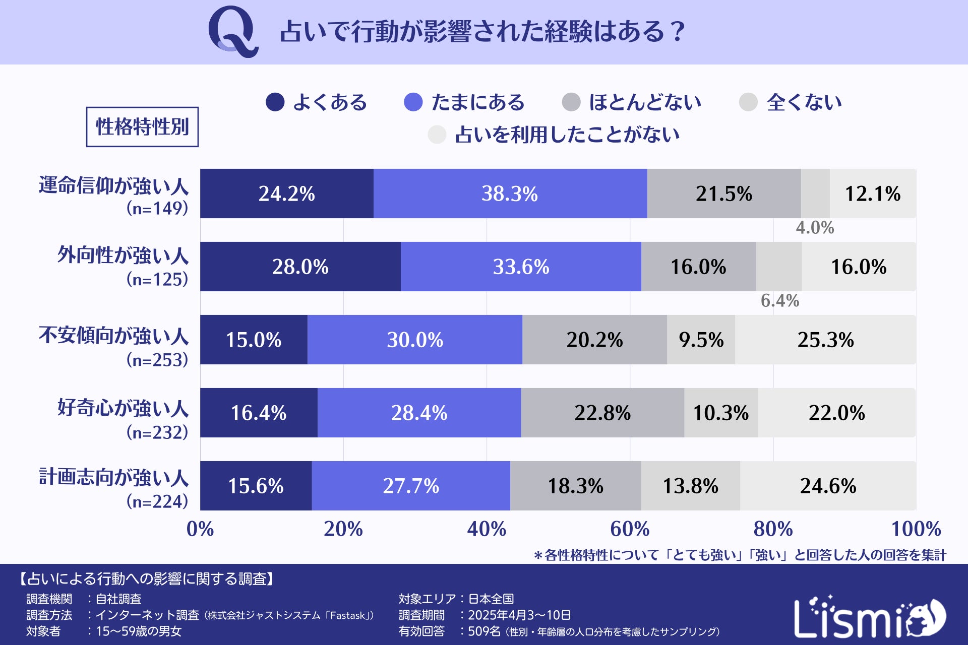 チャット占いアプリを提供する株式会社リスミィ( https://lismi.jp/ )(本社:大阪府大阪市、代表:池内康浩)は、占いが人々の意思決定にどのような影響を与えているのかを調査するため、15~59歳の男女509名を対象にアンケートを行いました。本調査からは、占いが多くの人の行動に影響を与えていること、さらに世代や性格などによって影響の受け方が異なることがわかりました。