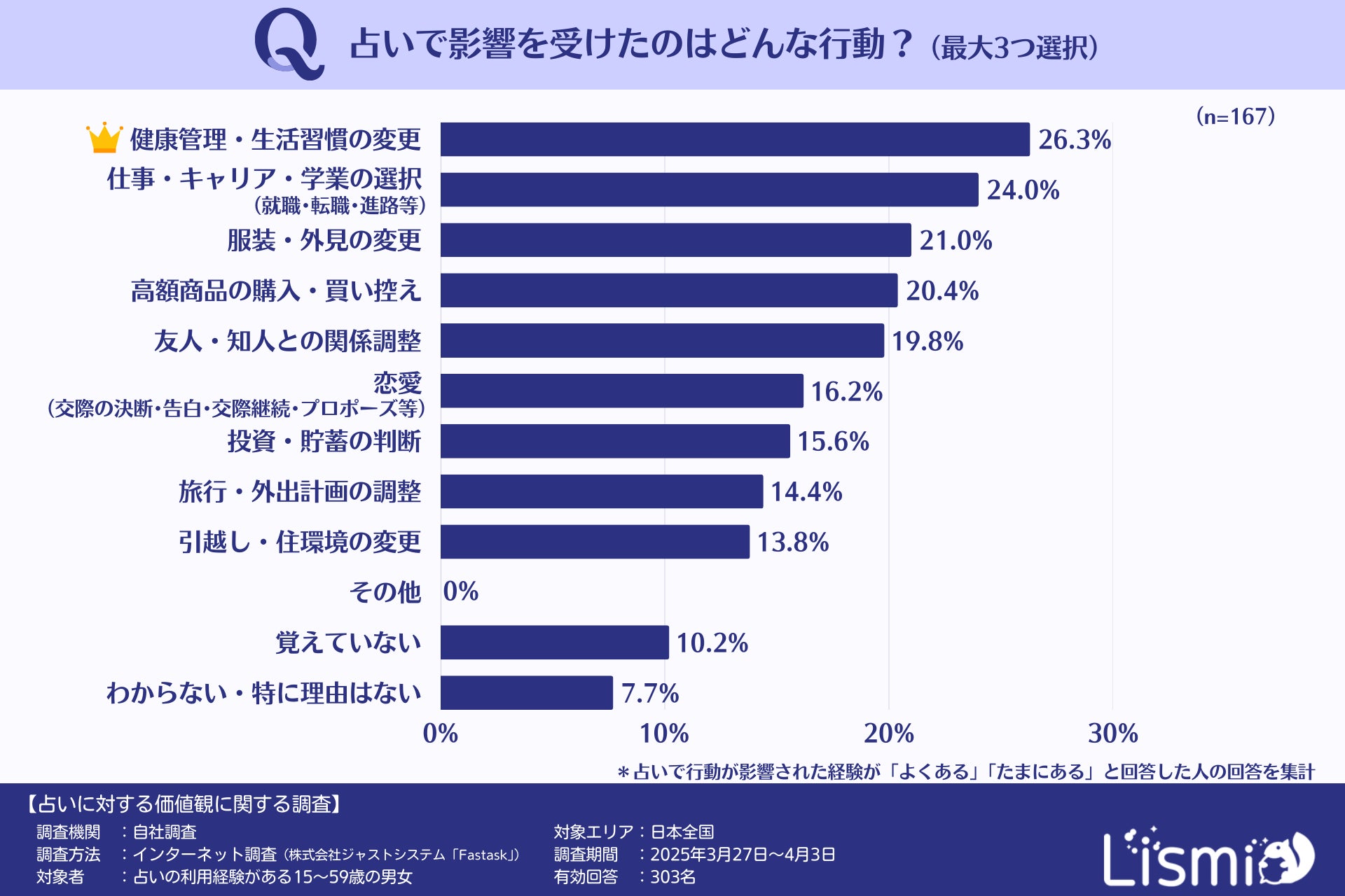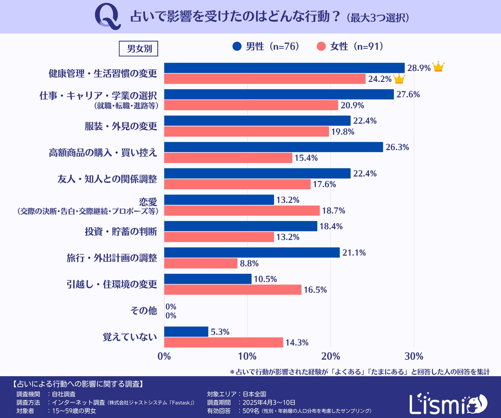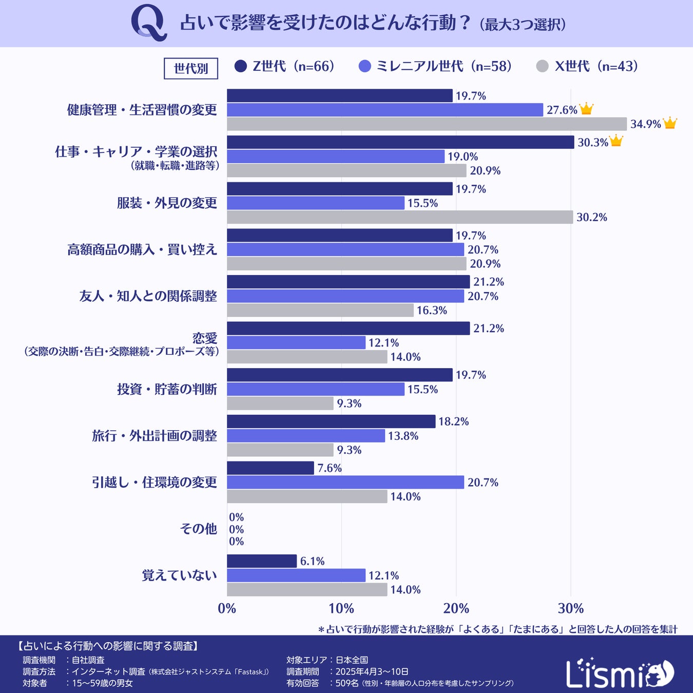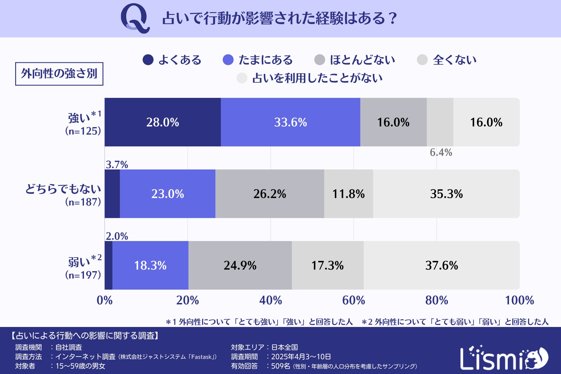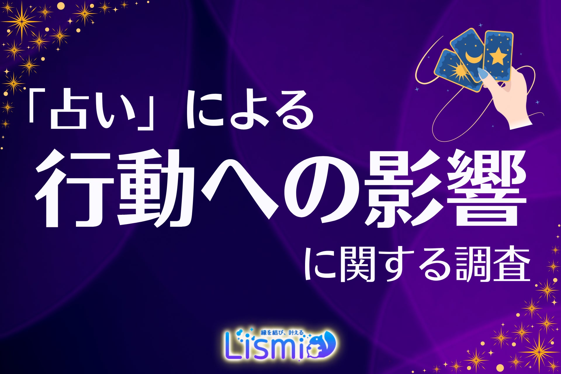 チャット占いアプリを提供する株式会社リスミィ( https://lismi.jp/ )(本社:大阪府大阪市、代表:池内康浩)は、占いが人々の意思決定にどのような影響を与えているのかを調査するため、15~59歳の男女509名を対象にアンケートを行いました。本調査からは、占いが多くの人の行動に影響を与えていること、さらに世代や性格などによって影響の受け方が異なることがわかりました。