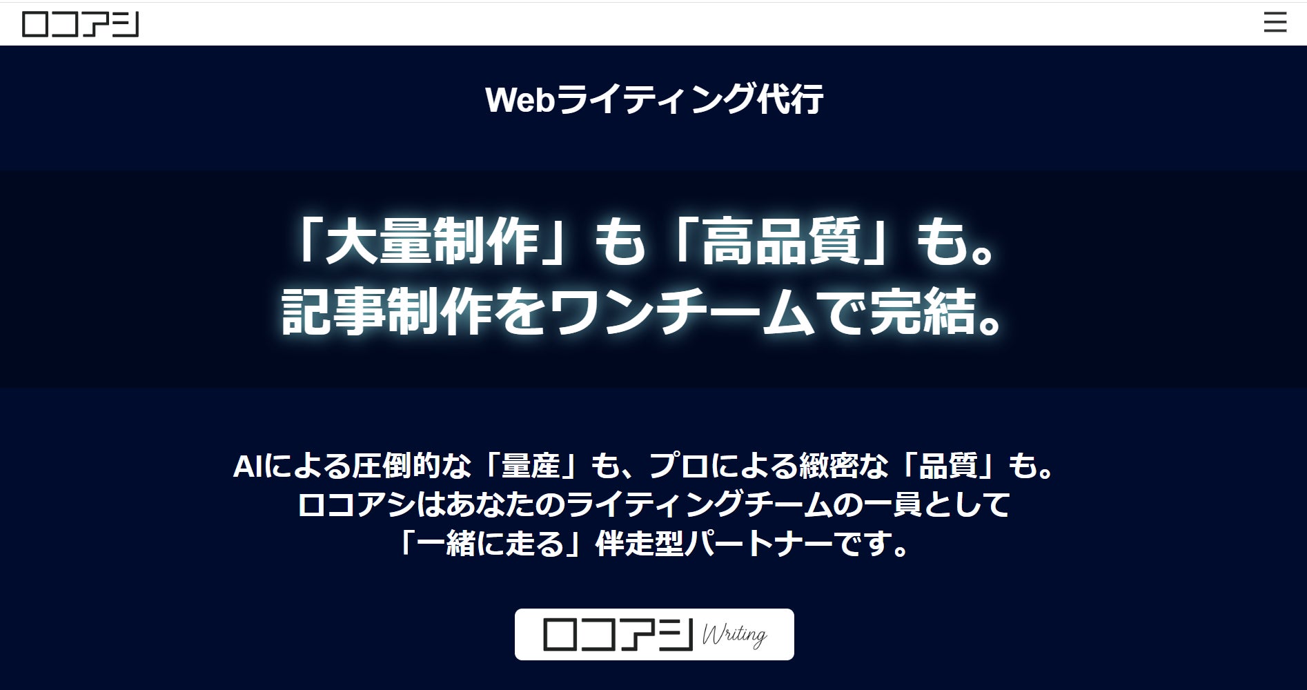 AIとプロのいいとこどりAI BPO「ロコアシ」を運営する株式会社ロコタビ(本社:東京都千代田区平河町2‑5‑3、代表取締役:高田大輔)は、2026年1月7日(水)より、オウンドメディア運営企業向けに特化したWebライティング代行サービス「ロコアシWriting」(URL: https://locoassi.com/writing )の提供を開始いたします。本サービスは、最新の生成AIによる圧倒的な生産スピードと、専属ディレクターによる厳格な品質管理を融合。従来のクラウドソーシング外注で課題となっていた「品質のバラつき」や、生成AI導入後に発生しがちな「事実確認やリライトの手間」を解消し、担当者が本来のマーケティング業務に集中できる環境を提供します。