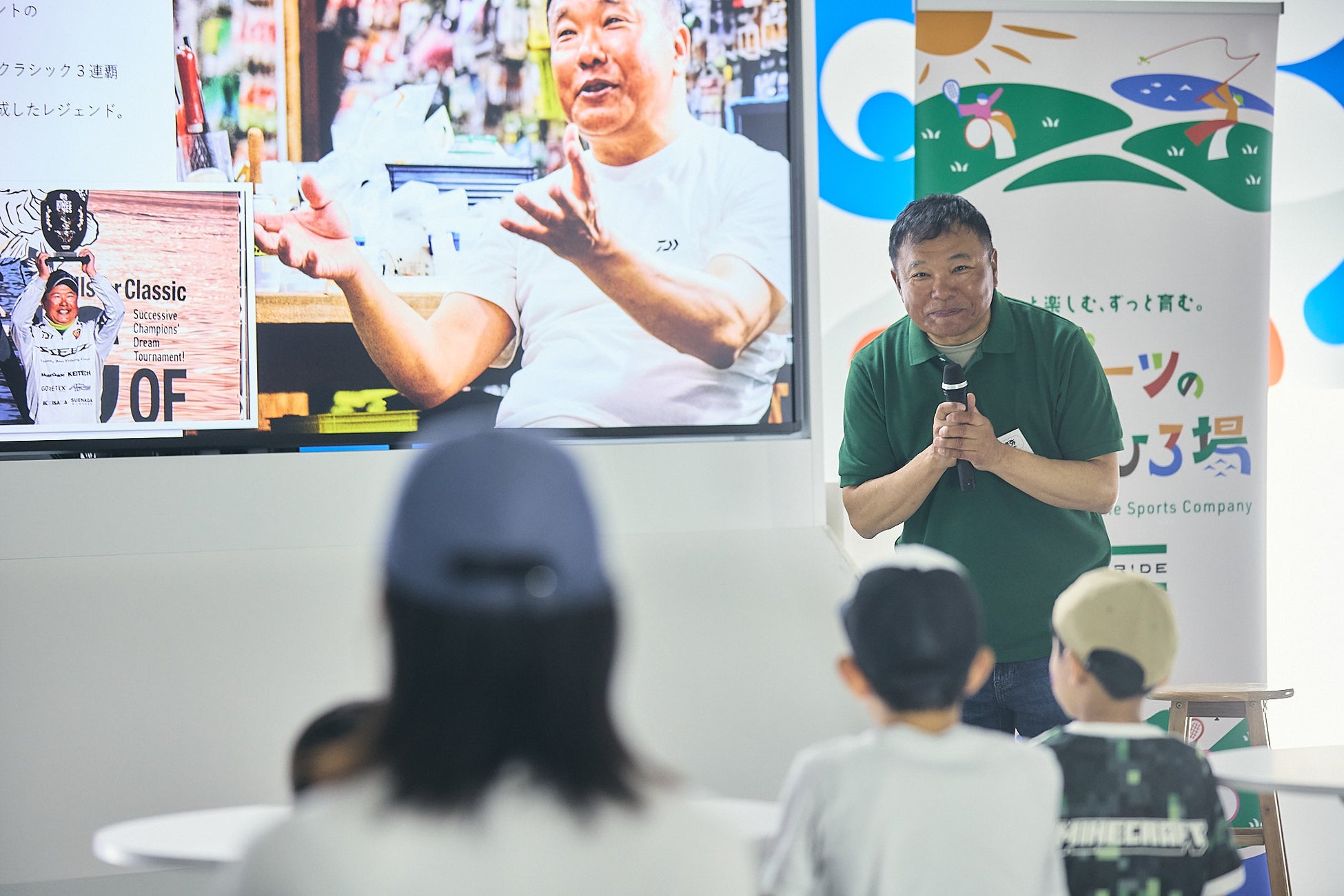 本イベントの講師として登壇されたフィッシングプロアングラーの赤羽修弥(あかばね・しゅうや)氏。ご自身の長年の釣り体験を交えながら、参加された子どもたちにも分かりやすく、時にはユーモアを交えた講演を行っていただきました。その冒頭、赤羽氏自身の迫力のあるフィッシングシーンの映像がイベント参加された子どもたちに驚きと日常と異なる好奇心を引きつけました。