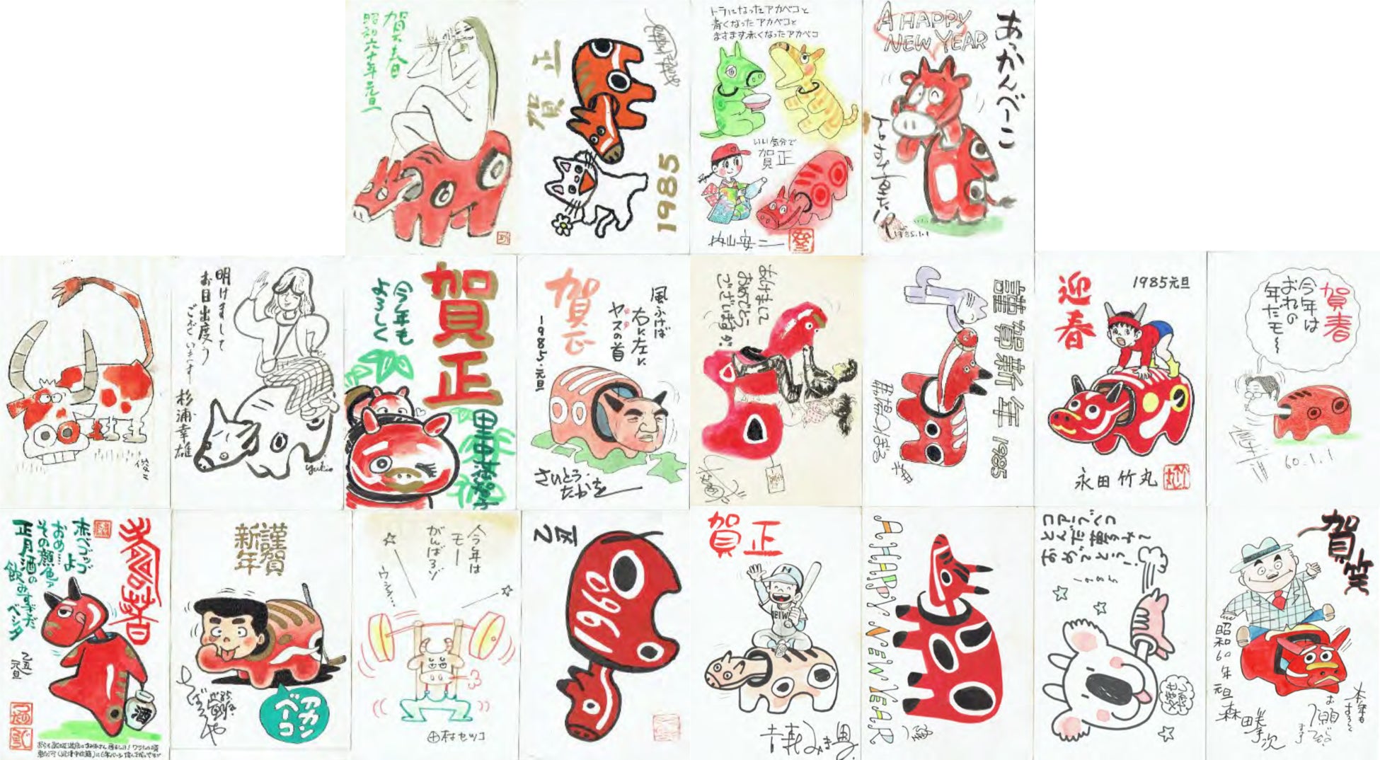1985年に漫画家協会20周年記念行事として、福島民友新聞社と共催した民友マンガ博が開催され、その際に展示していた肉筆の赤ベコ年賀状。石森章太郎、小島功、さいとう・たかを、田河水泡、ちばてつや、つのだじろう、馬場のぼる、やなせたかし、横山隆一、他