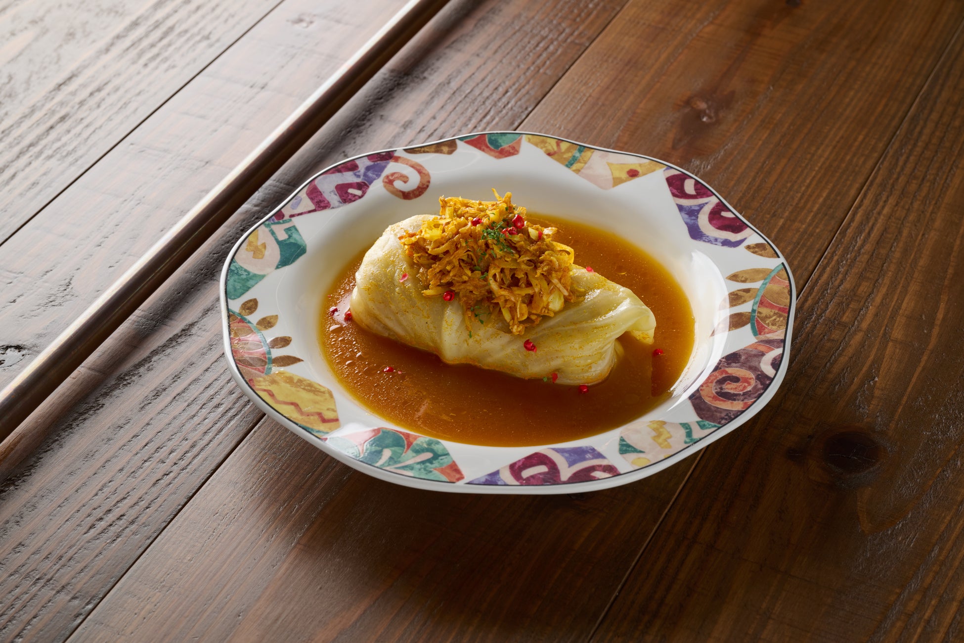 やわらかく煮込んだキャベツの中には、ジューシーな肉だね。そこに、特製ブレンドのカレーソースをたっぷりとかけました。数種類のスパイスが絶妙に調和し、爽やかなのにコク深い味わいを実現しています。