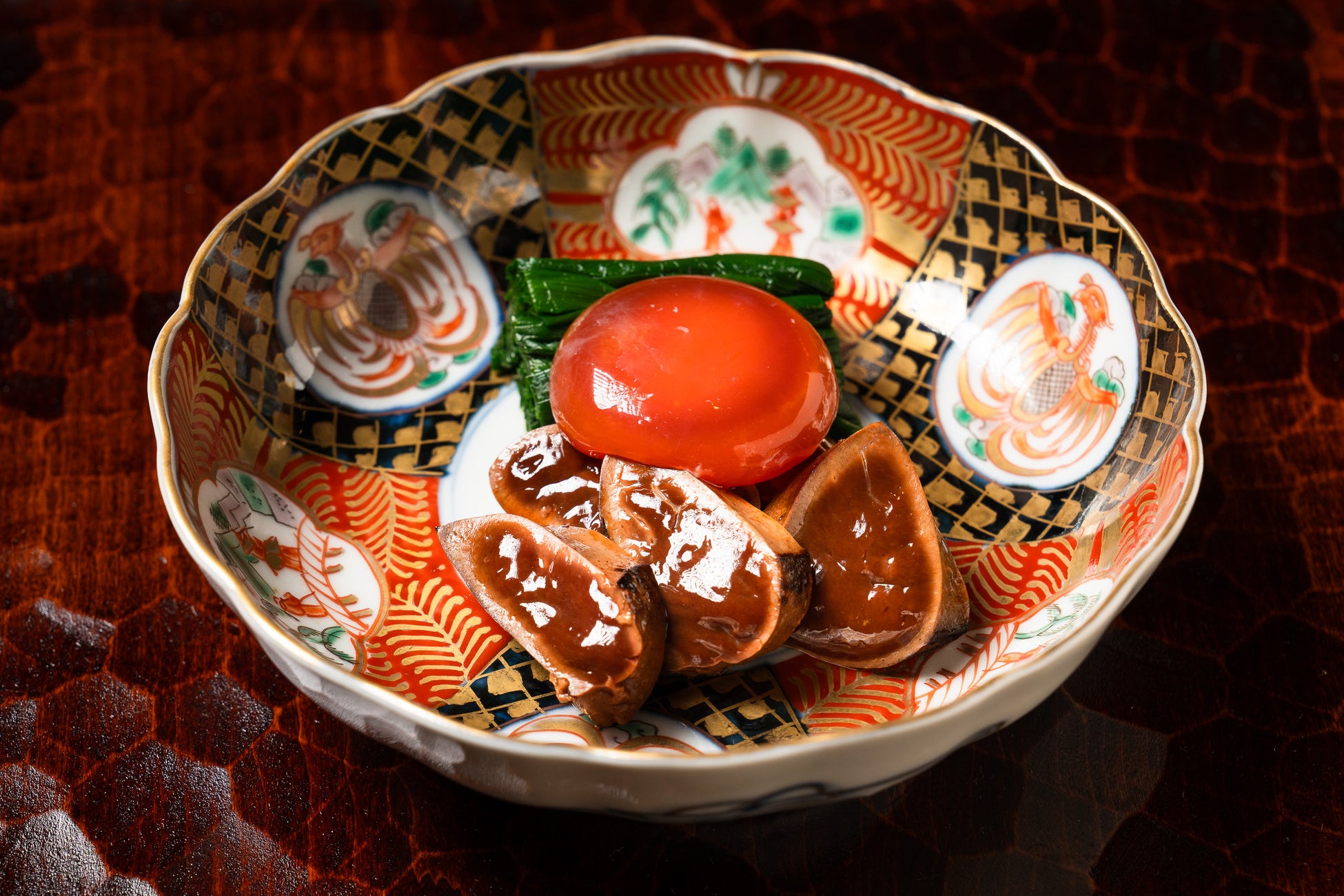 低温調理で仕上げたとろける食感のダチョウレバーに、香り高いお浸しニラと漬け卵黄を合わせました。和の技法で再構築した、繊細なレバニラです。