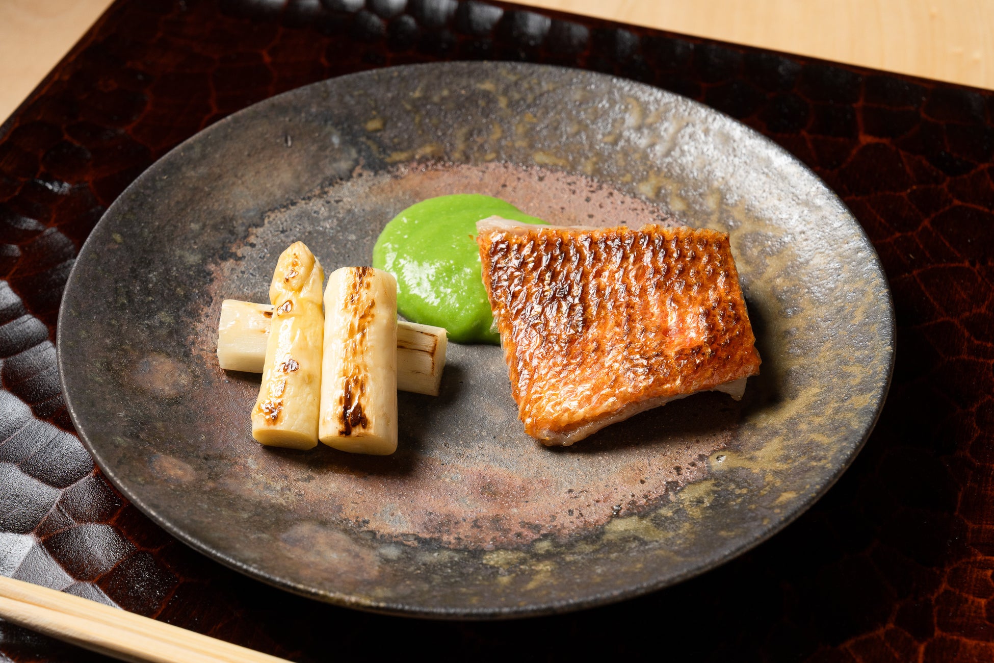 鱗をパリッと香ばしく焼き上げた金目鯛に、ふっくらとした身の旨味が重なります。