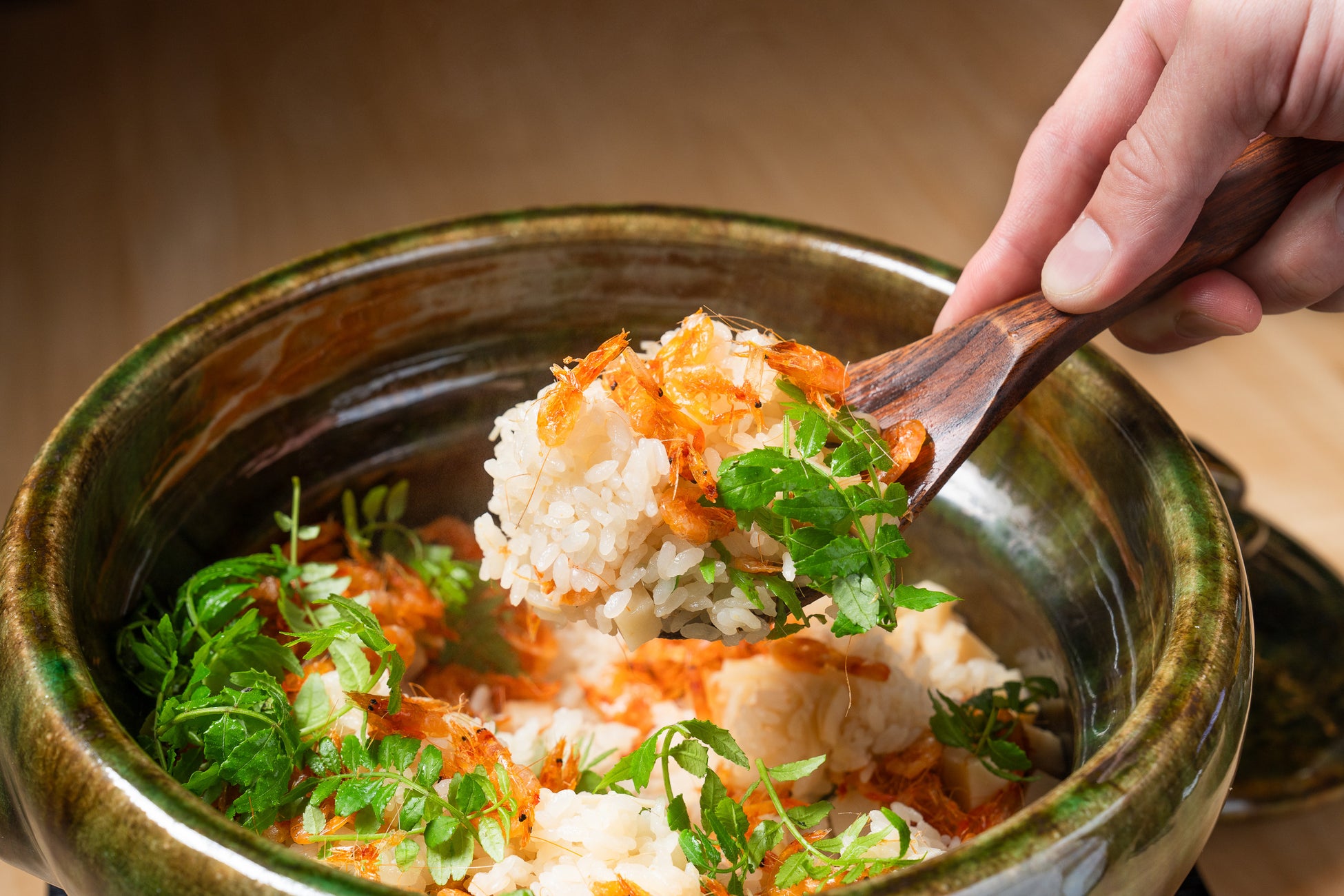 土鍋で炊き上げた香り高いご飯と旬の食材が極上のハーモニーを奏でる。