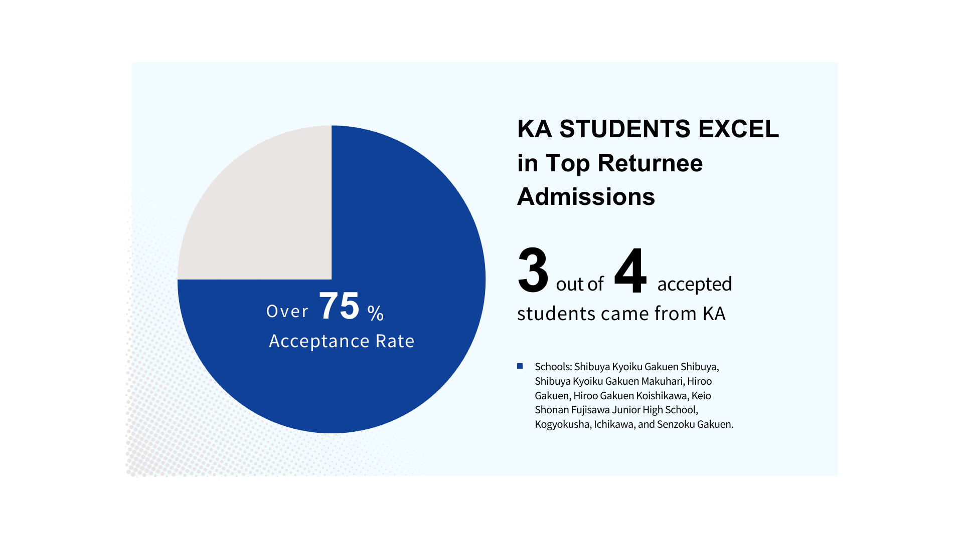 KA students accounted for more than 75% of successful applicants at some of Japan’s most competitive schools, including Shibuya Kyoiku Gakuen Shibuya Junior High School, Hiroo Gakuen, and Keio Shonan Fujisawa Junior High School (Keio SFC).