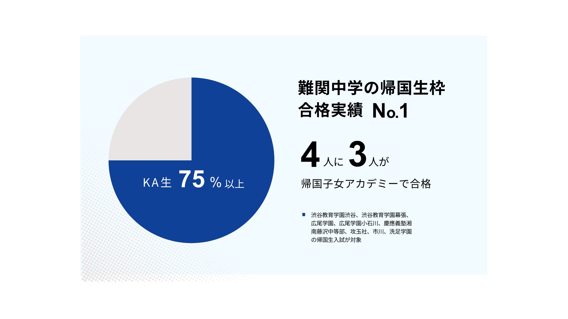 帰国子女アカデミー(以下、KA)は、2025年度の中学帰国子女入試において、渋谷教育学園渋谷中学校、広尾学園中学校をはじめとする難関校で、合格者の75%以上を占める高い実績を記録しました。特に渋谷教育学園渋谷中学校においては合格者全員がKA在籍生となり、これは2022年度に続き2度目の快挙となります。グローバル人材の育成が重視される中、英語力に加え、思考力・表現力を育む独自の指導により、帰国生入試で圧倒的な成果を上げています。