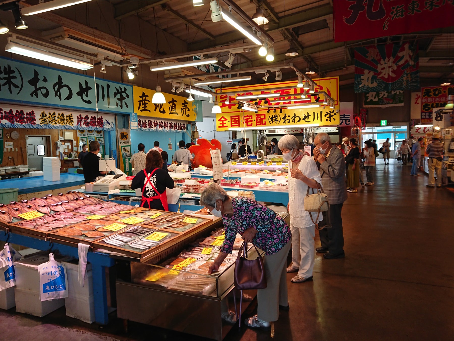 ・様々な種類の新鮮な鮮魚、干物、貝類から選んで購入